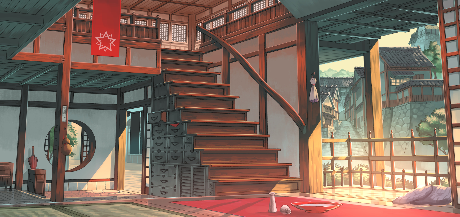 architecture banner bottle column commentary_request cup day east_asian_architecture gourd highres indoors nagi_itsuki no_humans original pillar pixiv_fantasia pixiv_fantasia_age_of_starlight rock sakazuki sake_bottle scenery stairs star_(symbol) tatami tree