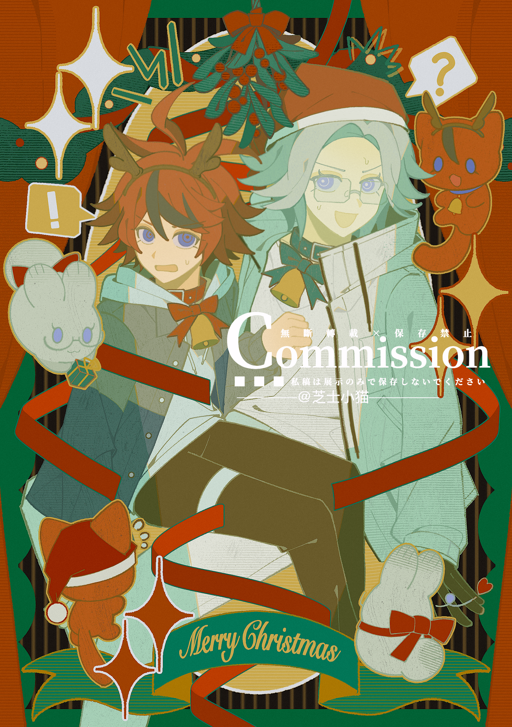 ! 2boys :d ? absurdres ahoge animalization antlers aotsuki_eito bell black_collar black_gloves black_pants black_streaks blue_eyes bow bowtie bright_pupils cat chinese_commentary christmas collar commentary_request commission fake_antlers flying_sweatdrops gift glasses gloves green_bow green_bowtie grey_hair grey_jacket hat heart highres hood hoodie horns jacket jacket_over_hoodie looking_at_viewer male_focus merry_christmas mistletoe multicolored_hair multiple_boys neck_bell on_lap open_clothes open_jacket open_mouth pants person_and_animalization purple_eyes rabbit red_bow red_collar red_hair red_hat red_pupils red_ribbon reindeer_antlers ribbon santa_hat shirt short_hair smile solid_oval_eyes spoken_exclamation_mark spoken_question_mark streaked_hair sumino_takumi sweatdrop the_hundred_line_-last_defense_academy- two-tone_hair watermark white_hoodie white_jacket white_pants white_pupils white_shirt zheidaxuewoshifeishangbukema