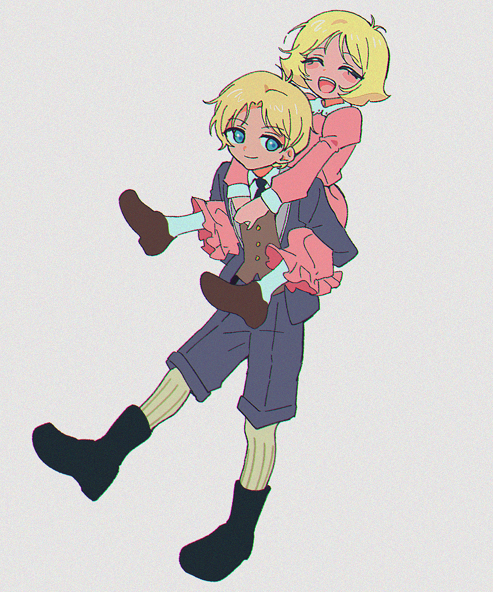 1boy 1girl :d ^_^ arms_around_neck artesia_som_deikun black_boots black_necktie blonde_hair blue_eyes blue_jacket blue_shorts blush boots brother_and_sister brown_shoes brown_vest carrying casval_rem_deikun char_aznable chromatic_aberration closed_eyes closed_mouth collared_dress collared_shirt commentary_request dress film_grain gundam jacket juliet_sleeves long_sleeves mobile_suit_gundam_the_origin necktie open_clothes open_jacket open_mouth piggyback pink_dress puffy_sleeves sayla_mass shirt shju0101 shoes short_hair shorts siblings simple_background smile socks teeth upper_teeth_only vest white_background white_shirt white_socks wing_collar yellow_socks