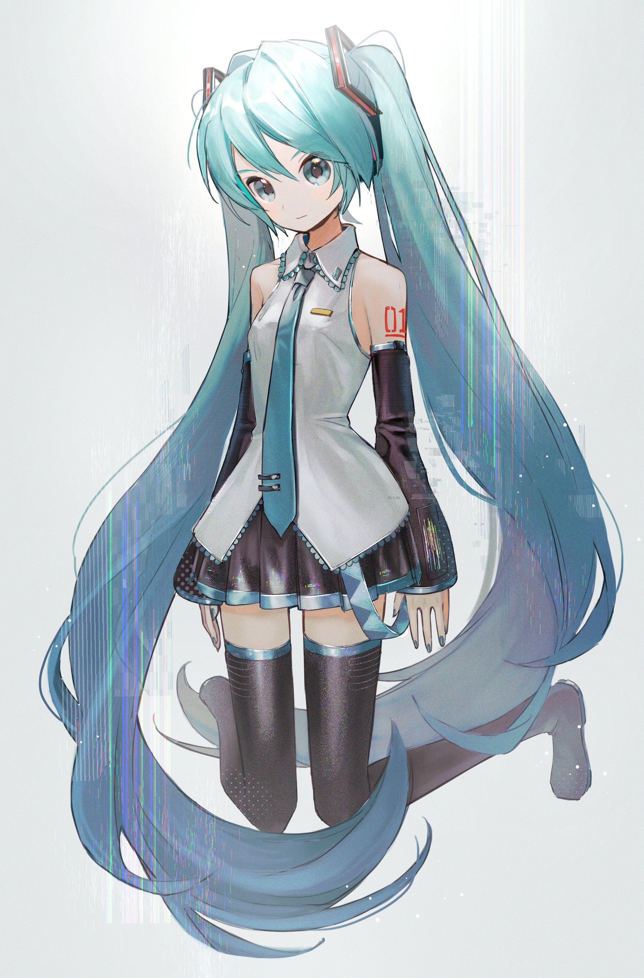 1girl absurdres blue_eyes blue_hair boots collared_shirt commentary detached_sleeves full_body hair_ornament hatsune_miku headphones highres long_hair long_sleeves miyononon nail_polish necktie pleated_skirt shirt skirt sleeveless sleeveless_shirt smile solo thigh_boots twintails very_long_hair vocaloid