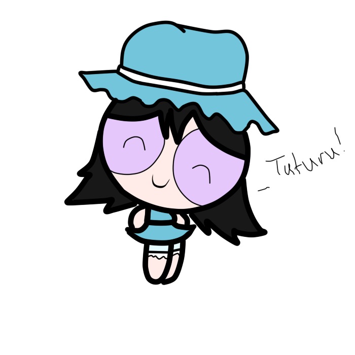1girl barefoot black_hair blue_dress blue_hat cartoon_network chibi closed_eyes drawfag dress female_focus hat long_hair parody powerpuff_girls science_adventure shiina_mayuri smile solo steins;gate style_parody white_background