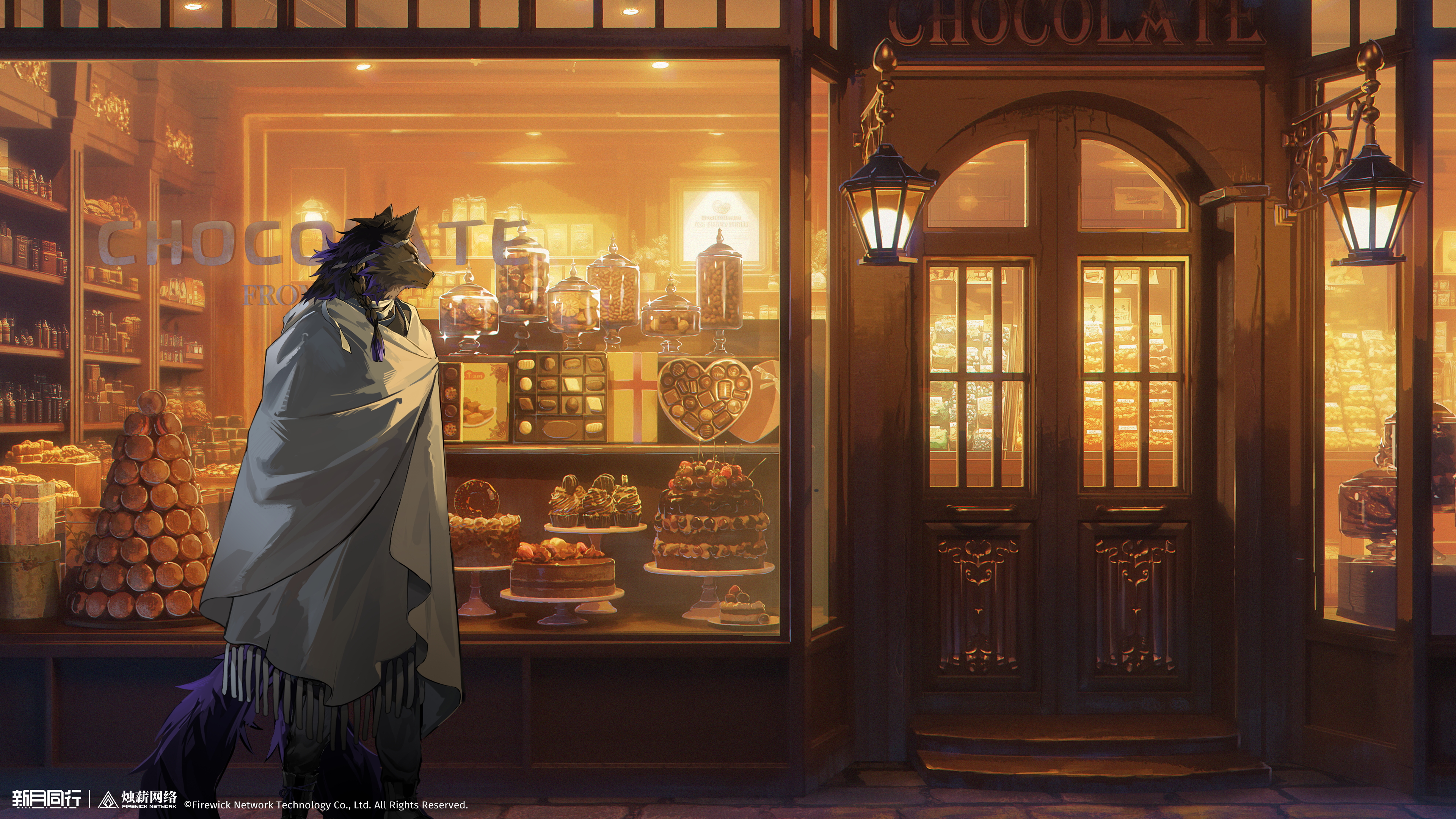 1boy abisi_(xinyue_tongxing) absurdres black_fur box box_of_chocolates cake chocolate chocolate_cake copyright_name copyright_notice door extra_tails feet_out_of_frame food furry furry_male grey_robe highres jar logo male_focus official_art official_wallpaper profile robe shop wall_lamp wolf_boy xinyue_tongxing yellow_eyes yellow_light