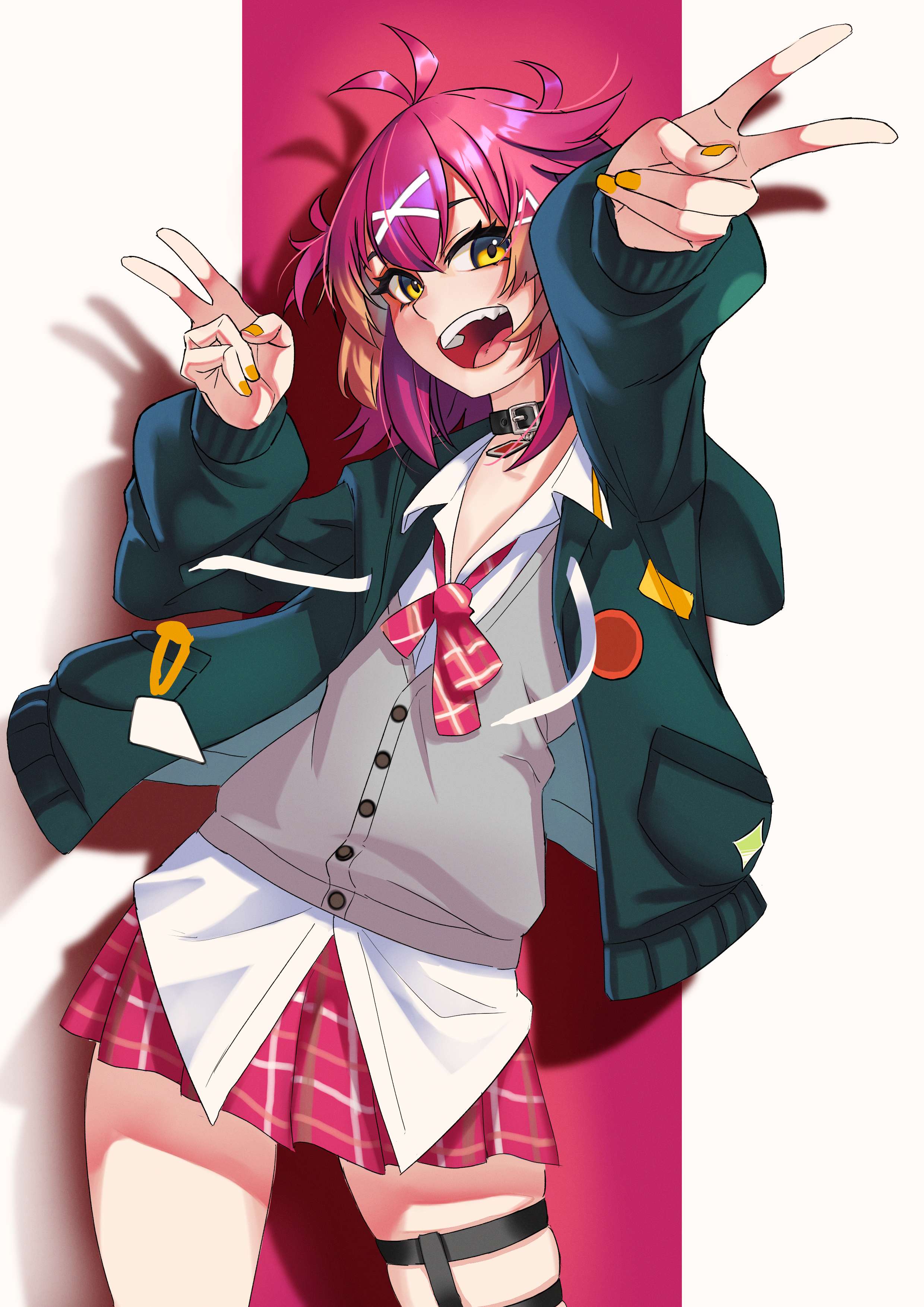 1girl absurdres antenna_hair choker cross_hair_ornament double_v green_hoodie grey_vest hair_ornament highres hood hoodie indie_virtual_youtuber ohitspiper open_mouth pink_skirt pleated_skirt red_background red_hair rodc_art school_uniform shirt skirt thigh_strap thighs tongue v vest virtual_youtuber white_background white_shirt yellow_eyes