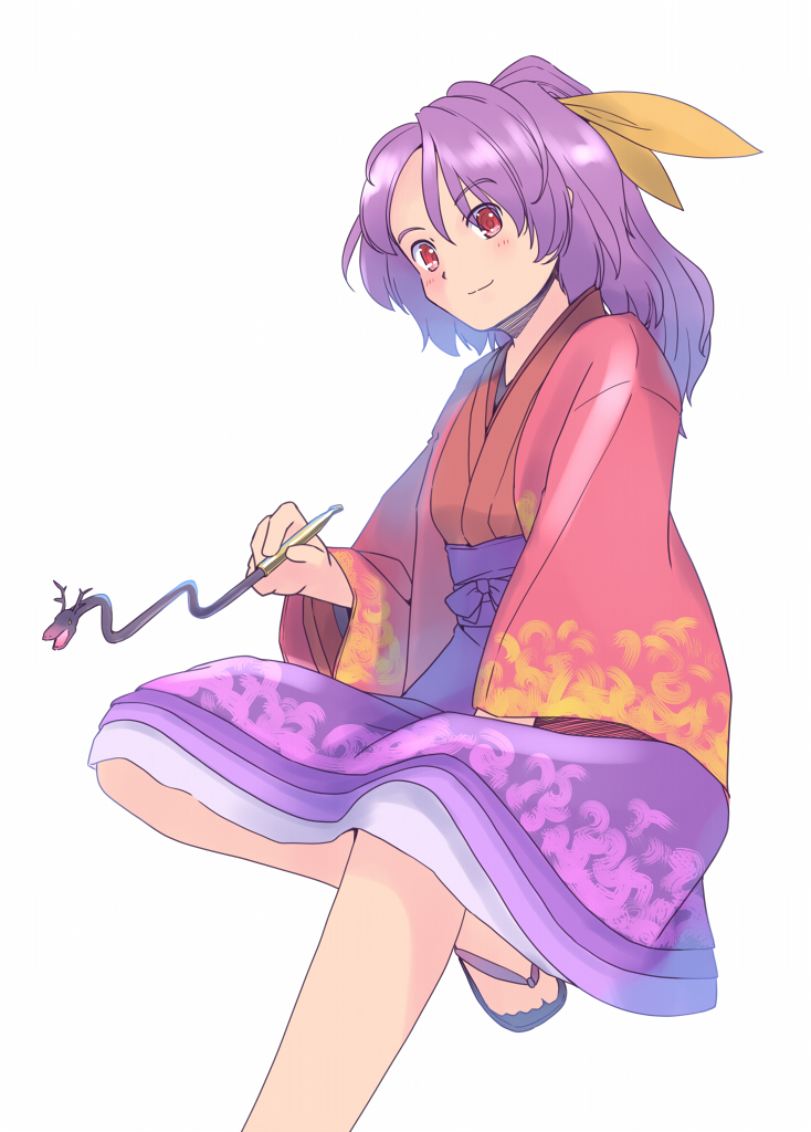1girl blush commentary_request crossed_legs foot_out_of_frame hair_ribbon holding holding_smoking_pipe japanese_clothes kimono komakusa_sannyo light_smile long_hair long_sleeves looking_down ponytail purple_hair purple_skirt rangycrow red_eyes red_kimono ribbon sandals sitting skirt smoking_pipe solo touhou white_background yellow_ribbon