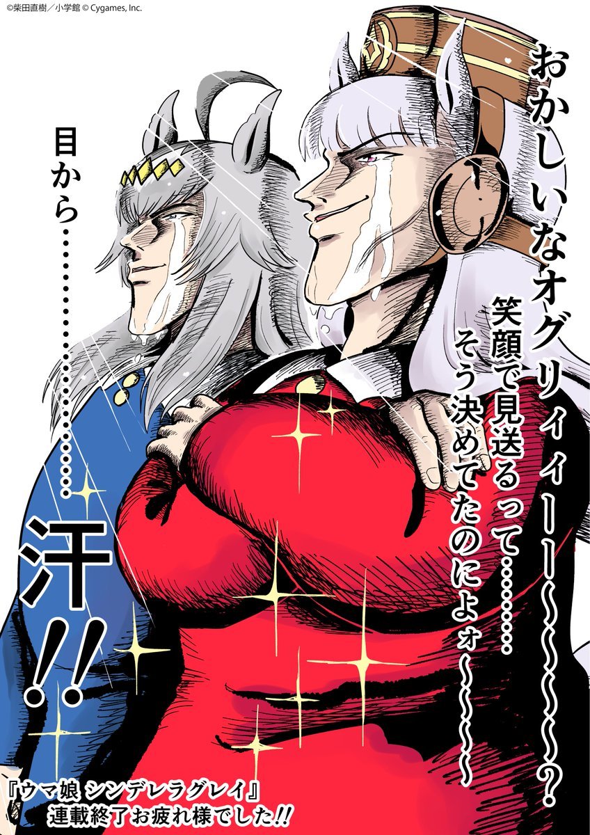 2girls ahoge animal_ears blue_dress blue_eyes blunt_bangs brown_hat commentary_request crossed_arms crying dress gold_ship_(umamusume) grey_hair hair_between_eyes hair_ornament hat highres horse_ears horse_girl long_hair long_sleeves multicolored_hair multiple_girls oguri_cap_(umamusume) parted_lips pillbox_hat red_dress second-party_source shibata_naoki smile sparkle streaming_tears tears umamusume umamusume:_cinderella_gray umamusume:_peace_peace_cepea_cepea_golshi-chan