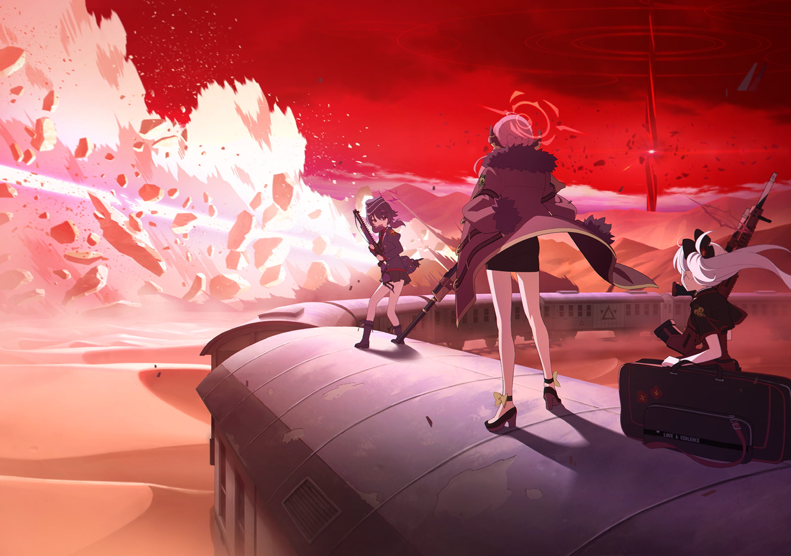 3girls artist_request aru_(blue_archive) black_scrunchie black_shirt black_shoes black_skirt blue_archive coat coat_on_shoulders demon_girl demon_horns desert explosion game_cg hair_ornament hair_scrunchie halo haruka_(blue_archive) hat high-waist_skirt high_heels highres horns jacket miniskirt multiple_girls mutsuki_(blue_archive) non-web_source official_art open_mouth pencil_skirt purple_eyes purple_hair purple_halo purple_hat purple_jacket red_coat red_hair red_skirt red_sky scrunchie shirt shoes side_ponytail skirt sky train white_hair