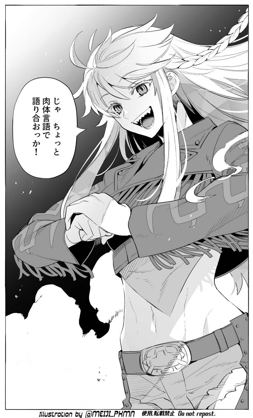 1girl :d belt belt_buckle braid breasts buckle commentary cracking_knuckles crop_top fate/grand_order fate_(series) fringe_trim greyscale highres jacket kukulkan_(fate) kukulkan_(first_ascension)_(fate) long_hair looking_ahead medium_breasts meiji_ken midriff monochrome open_mouth sharp_teeth shorts smile solo teeth tongue very_long_hair