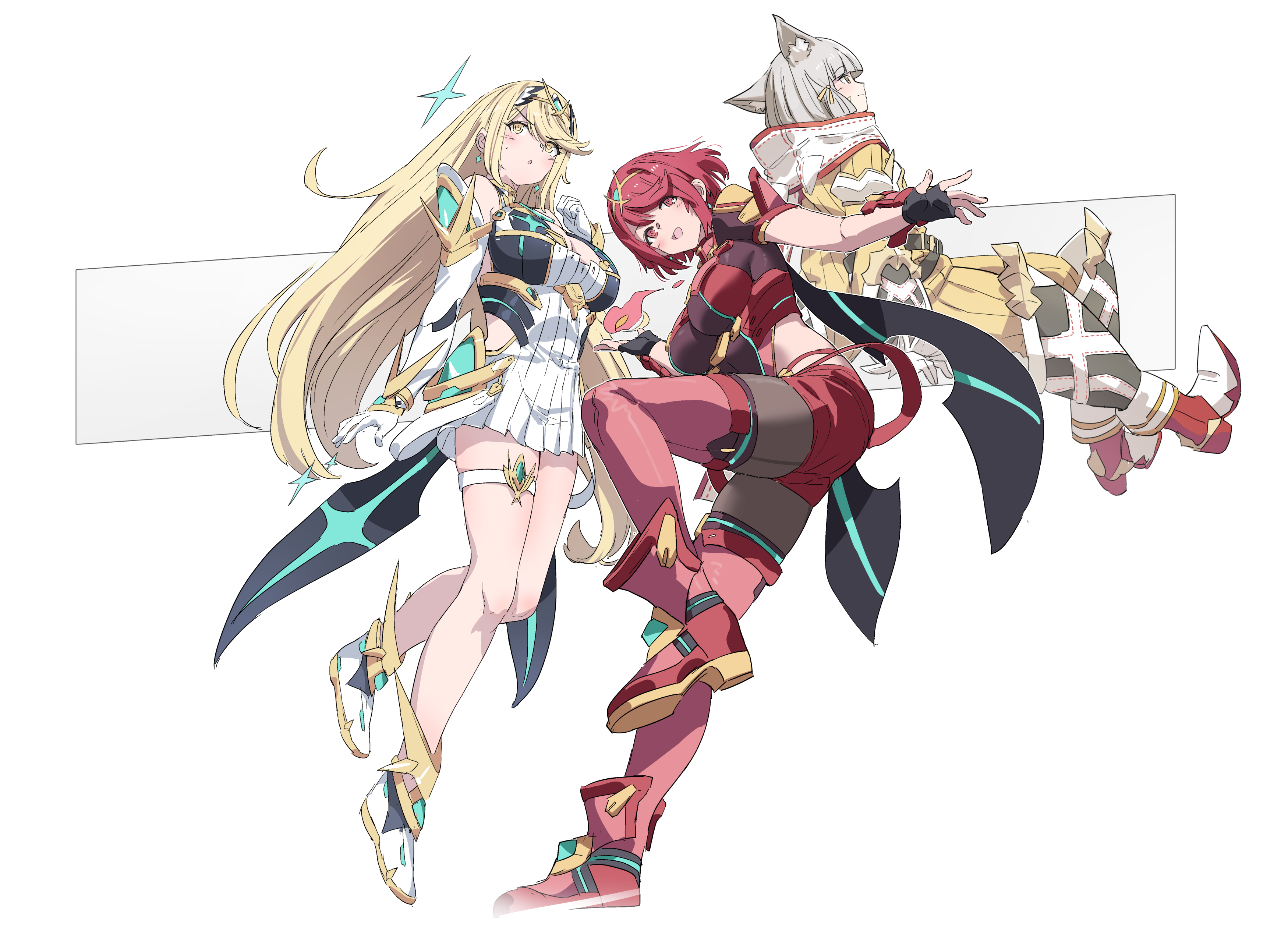 3girls absurdres blonde_hair breasts highres huanxiang_huifeng large_breasts multiple_girls mythra_(xenoblade) nia_(xenoblade) pyra_(xenoblade) red_hair xenoblade_chronicles_(series) xenoblade_chronicles_2