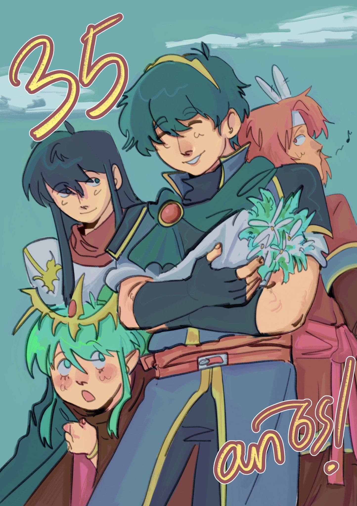 2boys 2girls anniversary blue_eyes blue_hair bouquet caeda_(fire_emblem) closed_eyes commentary english_commentary fire_emblem fire_emblem:_mystery_of_the_emblem flower green_hair haunterclere highres long_hair marth_(fire_emblem) multiple_boys multiple_girls nintendo pointy_ears red_hair short_hair smile tiara tiki_(fire_emblem) tiki_(young)_(fire_emblem) xane_(fire_emblem)