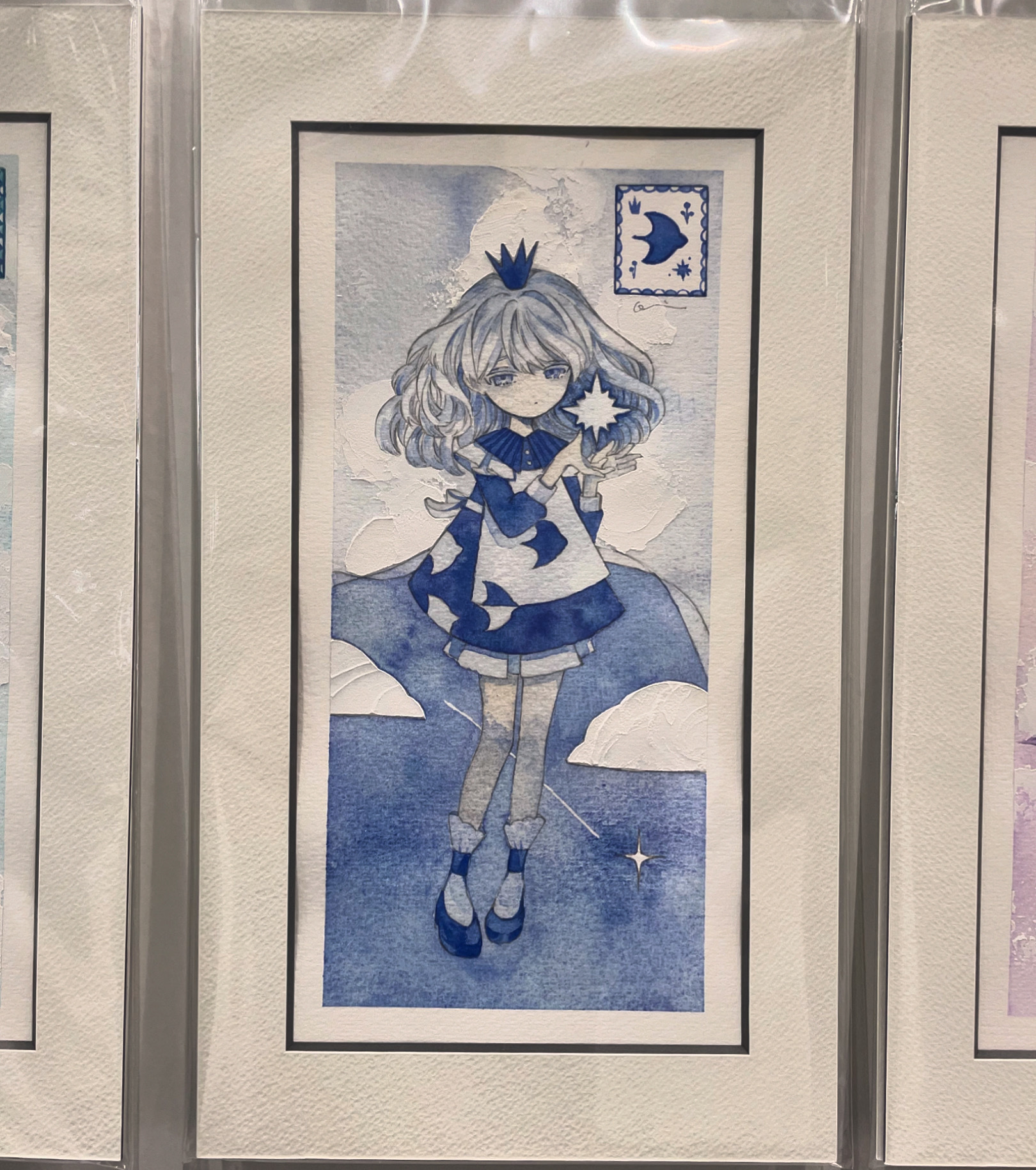 1girl acrylic_paint_(medium) ankle_socks blue_dress border collared_dress commentary_request crown dress full_body highres holding holding_star karintoun long_hair long_sleeves looking_at_viewer manta_ray meteor monochrome original painting_(medium) pale_skin photo_(medium) shorts shorts_under_skirt sidelocks signature skirt sky socks solo sparkle star_(symbol) swept_bangs traditional_media watercolor_(medium) wavy_hair white_border