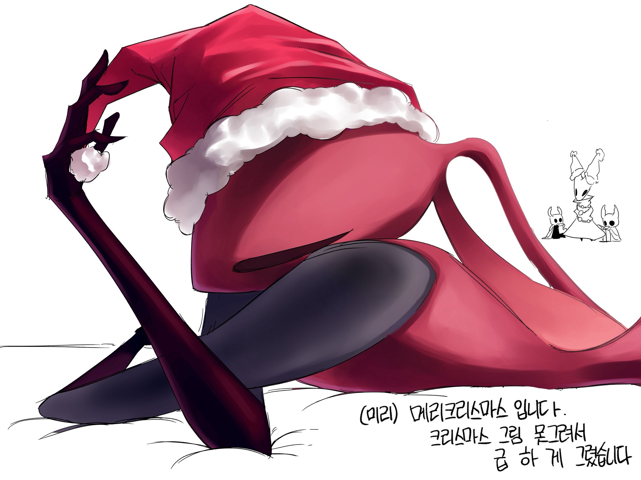 2girls 2others ant_girl arthropod_girl black_eyes cloak closed_eyes colored_skin from_side hat highres hollow_knight hollow_knight:_silksong hornet_(hollow_knight) knight_(hollow_knight) lying multiple_girls multiple_others no_humans on_stomach onehundredg100 red_hat red_skin santa_hat skarrsinger_karmelita_(hollow_knight) solo_focus standing translation_request