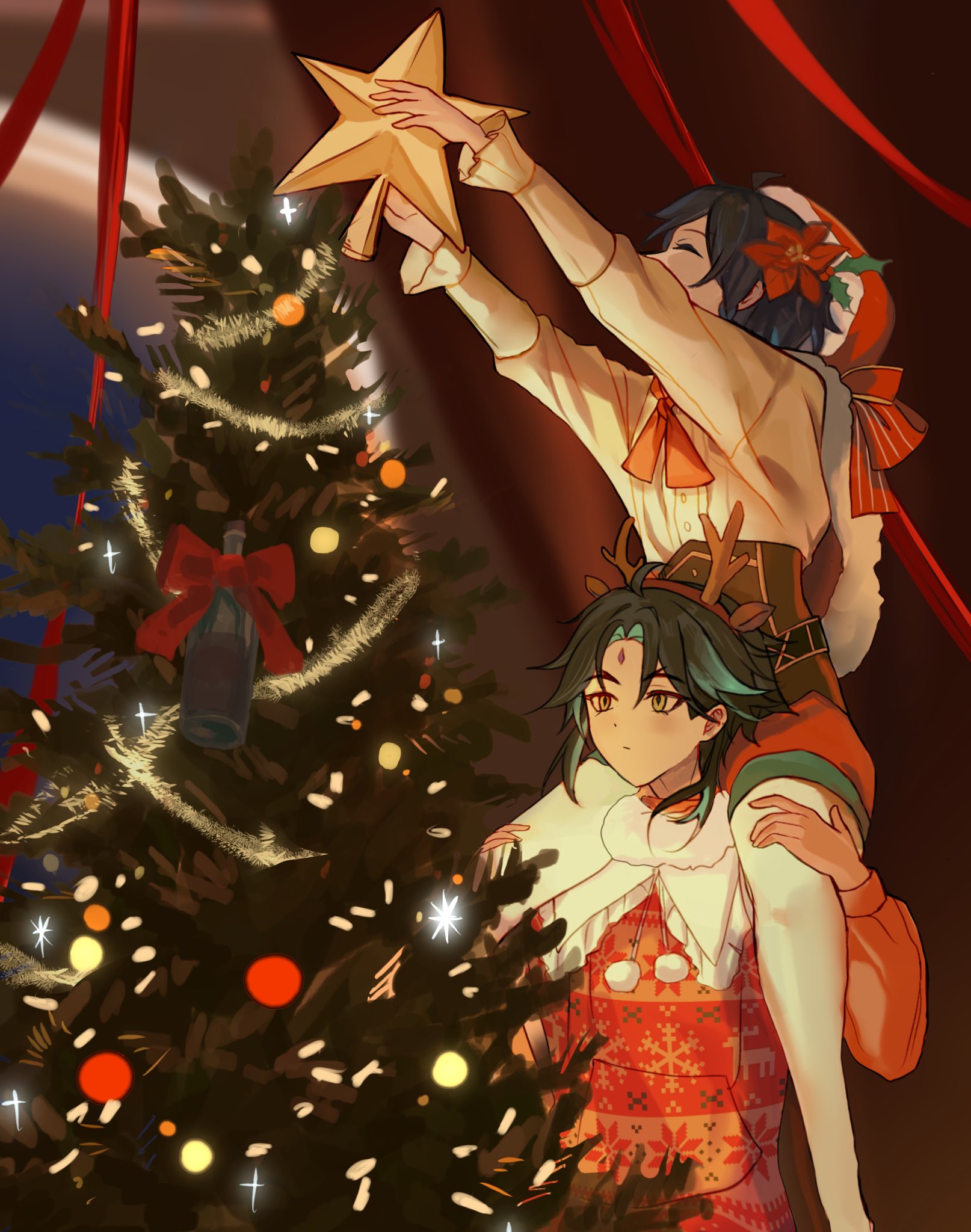 2boys antlers bottle christmas christmas_star christmas_tree closed_eyes closed_mouth covered_mouth genshin_impact hand_on_another's_thigh hat highres horns long_sleeves lumimellow multiple_boys on_person reindeer_antlers ribbon santa_hat sitting sitting_on_person venti_(genshin_impact) xiao_(genshin_impact) yellow_eyes