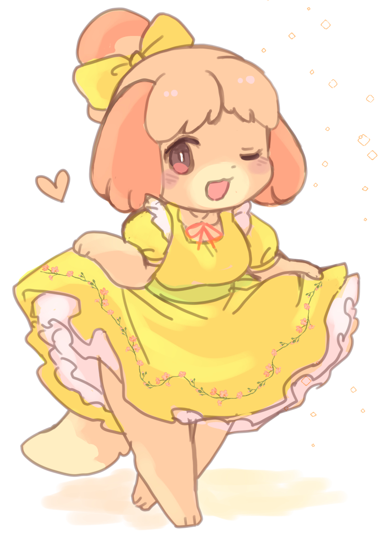 1girl :3 animal_crossing animal_crossing:_new_horizons animal_ears animal_nose blush body_fur bow commentary_request crossed_legs curtsey dog_ears dog_girl dog_tail dot_nose dress frills full_body furry furry_female hair_bow heart holding_own_dress isabelle_(animal_crossing) lifting_own_clothes looking_at_viewer neck_ribbon nintendo one_eye_closed open_mouth petticoat puffy_short_sleeves puffy_sleeves red_ribbon ribbon shirokuro_buti short_sleeves smile solo tail waist_ribbon watson_cross yellow_bow