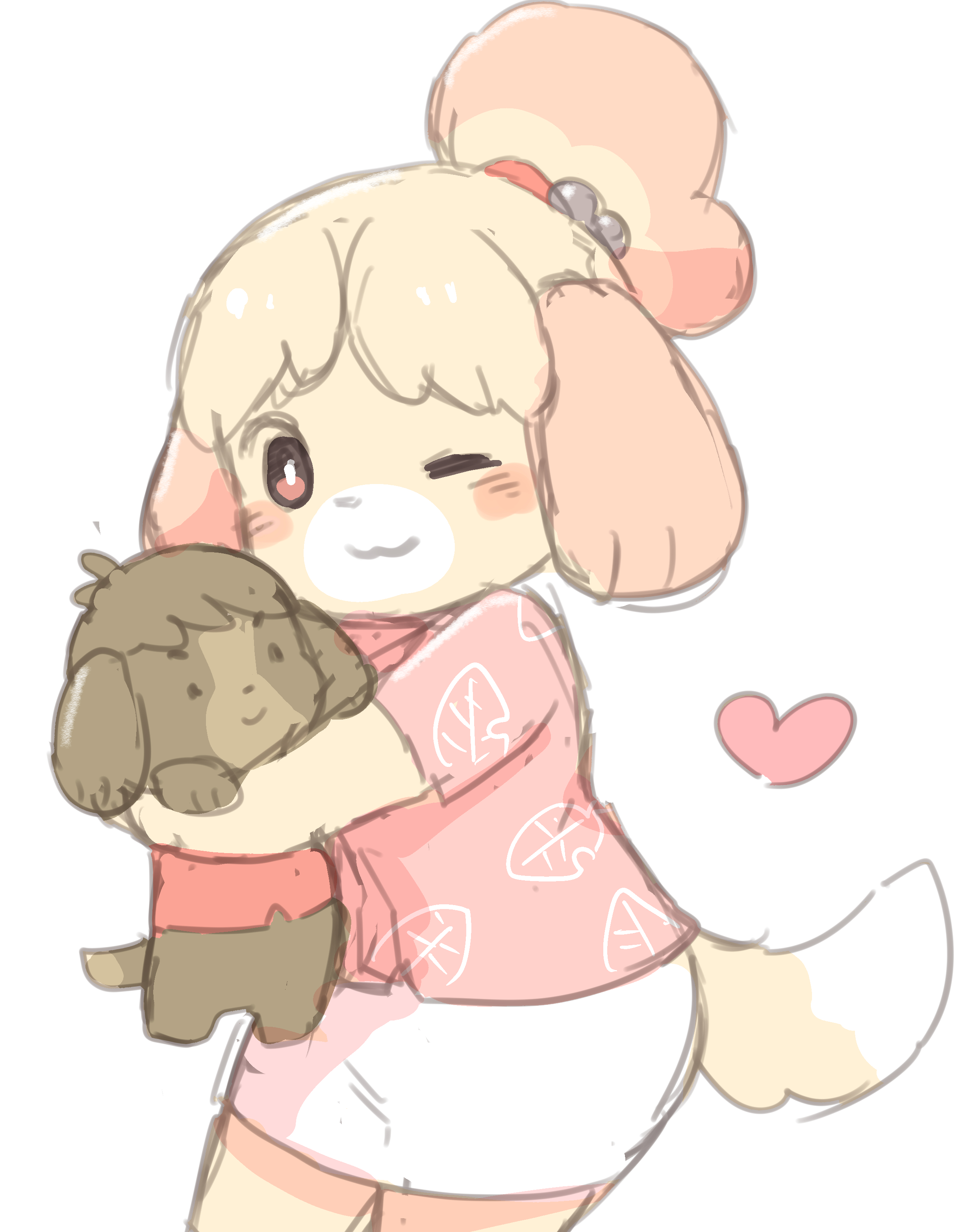 1girl :3 absurdres animal_crossing animal_crossing:_new_horizons animal_ears animal_nose bell blush body_fur character_doll closed_mouth commentary_request digby_(animal_crossing) dog_ears dog_girl dog_tail doll furry furry_female hair_bell hair_ornament heart highres holding holding_doll holding_stuffed_toy hugging_doll hugging_object isabelle_(animal_crossing) jingle_bell leaf_print looking_at_viewer nintendo one_eye_closed pink_shirt print_shirt shirokuro_buti shirt short_sleeves skirt smile solo stuffed_animal stuffed_toy tail white_background white_skirt