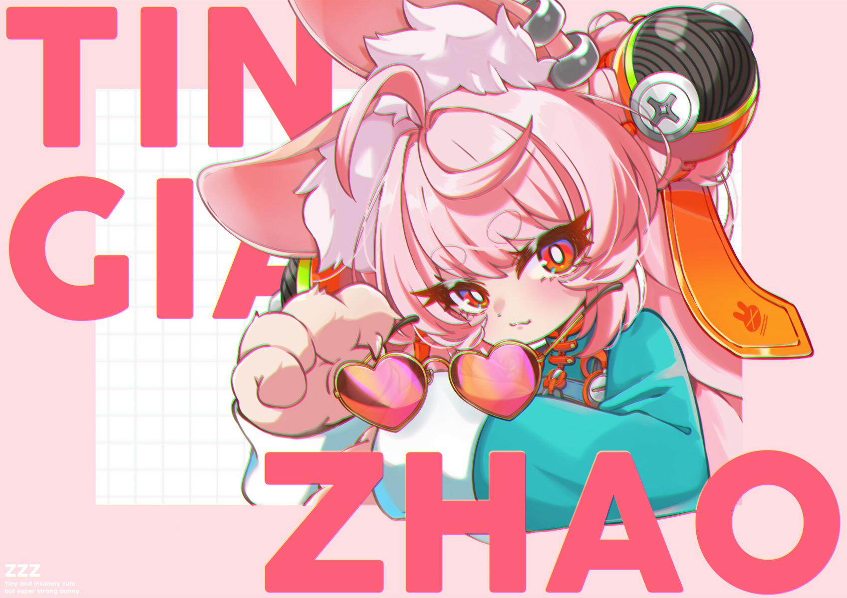 1girl :3 ahoge animal_ear_fluff animal_ear_piercing animal_ears border braid braided_twintails bright_pupils character_name checkered_background closed_mouth commentary english_commentary english_text furry furry_female green_shirt heart heart-shaped_eyewear highres holding holding_removed_eyewear long_hair looking_at_viewer pink_border pink_fur pink_hair rabbit_ears rabbit_girl red_eyes screw shirt short_eyebrows solo thick_eyebrows tsunakanten unworn_eyewear white_background white_pupils zenless_zone_zero zhao_(zenless_zone_zero)