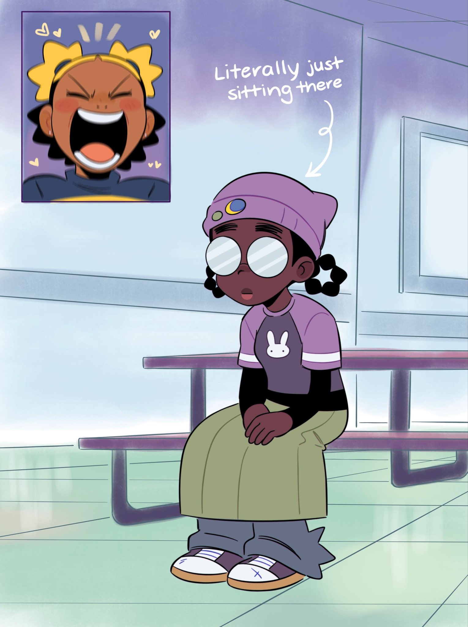 2girls aika_(kiana_mai) beanie black_hair blonde_hair blue_skirt blush closed_eyes dark-skinned_female dark_skin earrings english_text fan_screaming_at_madison_beer_(meme) glasses green_skirt hands_on_own_legs hat highres i_don't_want_to_be_a_magical_girl jewelry kiana_mai layered_sleeves long_skirt long_sleeves meme multiple_girls official_art on_bench opaque_glasses open_mouth pleated_skirt purple_shirt round_eyewear shirt short_over_long_sleeves short_sleeves shouting sitting skirt star-shaped_hair stud_earrings teeth tongue yuri zira_(kiana_mai)