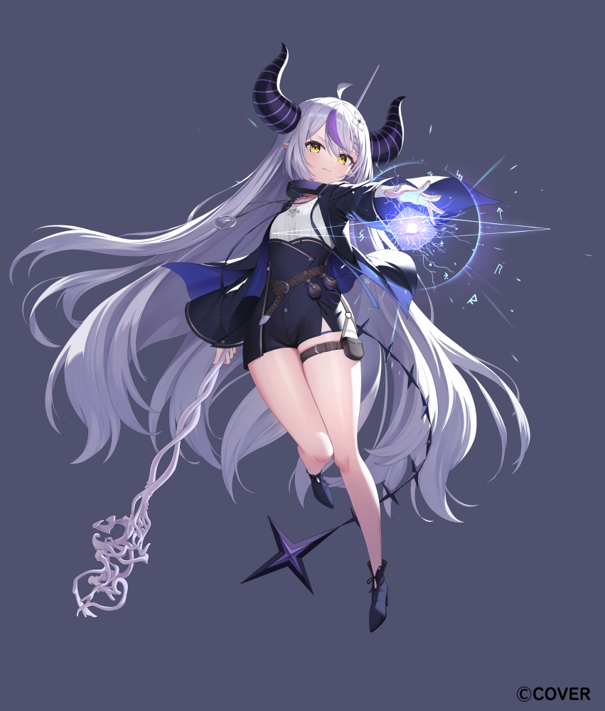 1girl ahoge alternate_costume black_boots black_horns black_jacket black_shorts boots braid braided_bangs closed_mouth collar commentary_request copyright_notice demon_horns double-parted_bangs flat_chest full_body grey_background grey_hair high-waist_shorts high_heel_boots high_heels holding holding_polearm holding_weapon hololive horns jacket la+_darknesss long_hair long_sleeves looking_at_viewer metal_collar multicolored_hair official_art outstretched_arm pointy_ears polearm pouch purple_hair shirt shirt_tucked_in short_shorts shorts simple_background slit_pupils solo streaked_hair striped_horns tail thigh_pouch tokisaka_makoto very_long_hair virtual_youtuber weapon white_shirt wide_sleeves yellow_eyes