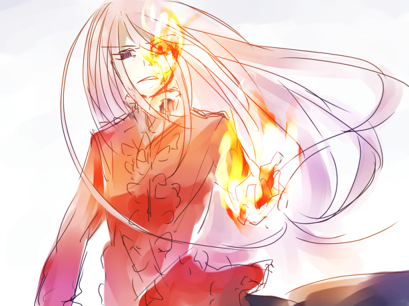 1girl 201_(yield) black_skirt chaos;child clenched_teeth fire haida_riko hair_over_one_eye high_collar jacket long_hair long_sleeves looking_at_viewer pyrokinesis red_jacket science_adventure shirt simple_background skirt solo teeth very_long_hair white_background white_shirt