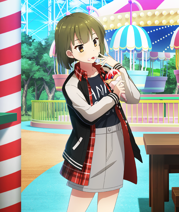 1girl amusement_park ban_tsugumi bench black_jacket blue_shirt blue_sky blunt_ends bob_cut clothes_writing cowboy_shot cream cream_on_face cream_on_finger crepe day dot_nose food food_on_face fruit game_cg green_hair grey_shorts hands_up holding holding_crepe holding_food jacket licking_finger licking_own_finger long_sleeves official_art open_clothes open_jacket open_shirt outdoors plaid_clothes plaid_shirt pole railing roller_coaster shirt short_hair shorts sky solo strawberry table third-party_source toji_no_miko toji_no_miko:_kizamishi_issen_no_tomoshibi tongue tongue_out tree unbuttoned wooden_bench wooden_table yellow_eyes