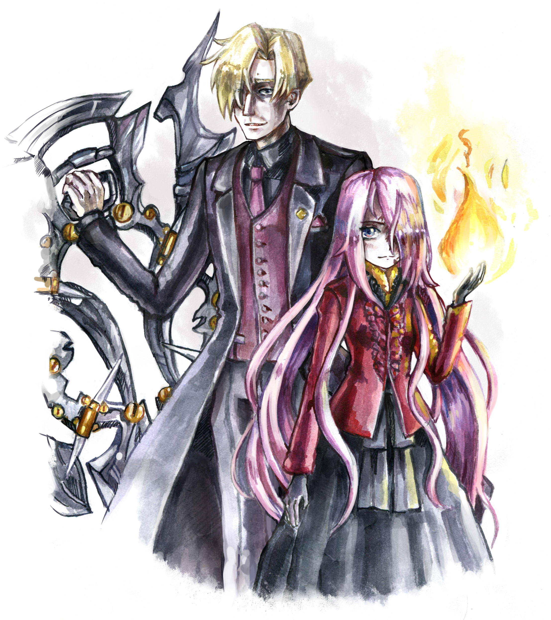 1boy 1girl absurdres black_coat black_dress black_gloves black_pants black_sash black_shirt blonde_hair blush chaos;child chaos;head coat d-sword dress dress_shirt fata_terra fire formal_clothes gloves haida_riko highres holding holding_sword holding_weapon jacket long_hair necktie norose_gen'ichi pants pink_hair pyrokinesis red_jacket red_necktie red_vest sash science_adventure shirt smile suit sword very_long_hair vest weapon
