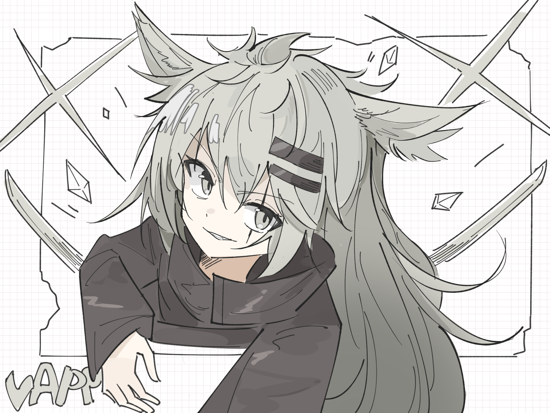 1girl animal_ears arknights black_jacket character_name commentary_request dot_nose enunomiya grey_eyes grey_hair grid_background hair_ornament hairclip highres jacket lappland_(arknights) long_hair long_sleeves originium_arts_(arknights) revision scar scar_across_eye scar_on_face sidelocks sleeves_past_wrists smile solo teeth upper_body wolf_ears wolf_girl