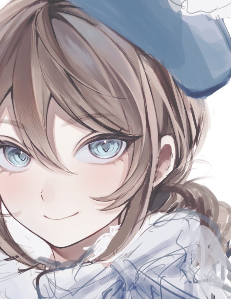 !_(rsa_yuhr) 1boy androgynous beret bishounen blue_eyes blue_hat brown_hair commentary_request edgar_valden hat identity_v light_blush looking_at_viewer male_focus ponytail portrait sidelocks smile solo trap