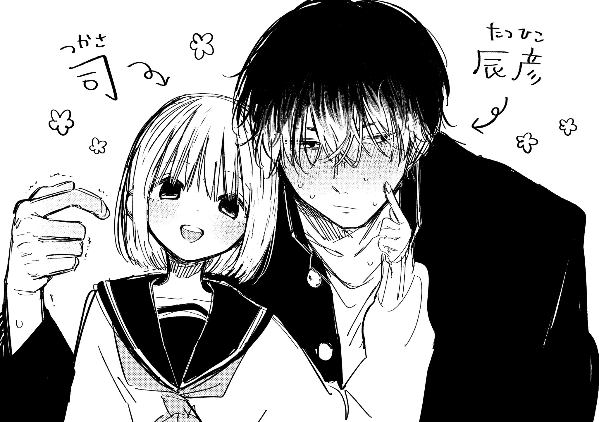 1boy 1girl averting_eyes blush closed_mouth colored_tips couple gakuran hand_up hetero highres index_finger_raised long_sleeves multicolored_hair neckerchief original sailor_collar school_uniform short_hair simple_background size_difference smile sweat teeth translation_request trembling upper_teeth_only wanoumi