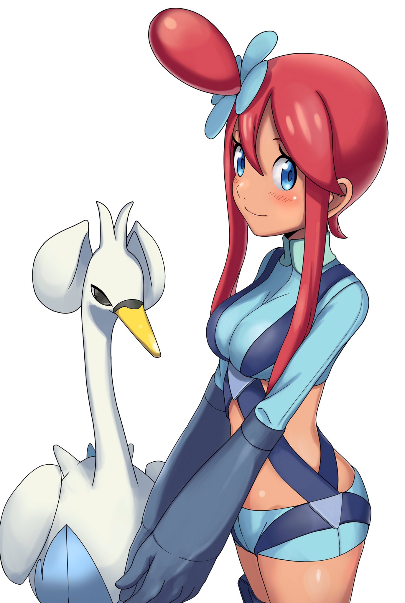 1girl beak bird blue_eyes blush breasts crop_top dark-skinned_female dark_skin from_side gen_5_pokemon gloves highres large_breasts long_sleeves midriff nintendo pokemon pokemon_black_and_white red_hair short_shorts shorts skyla_(pokemon) swanna white_background wings yoshinatsu