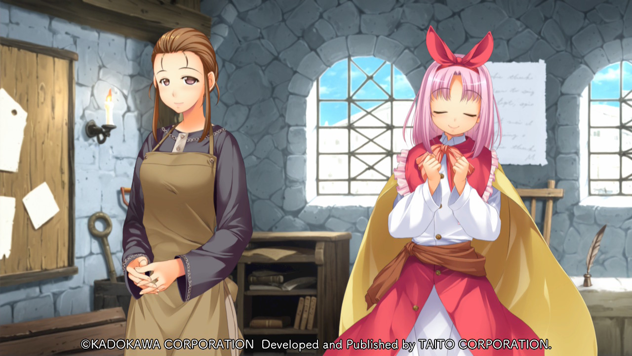 apron arisa_astia ascot atelier-moo blush breasts brown_apron brown_eyes brown_hair brown_sash brown_skirt candle capelet child clenched_hands closed_eyes closed_mouth collared_shirt company_name copyright_notice cowboy_shot curtained_hair day flat_chest frills game_cg grey_shirt hair_bun hairband hands_on_own_chest hands_up indoors large_variant_set laura_newfield_(revival) long_hair long_skirt long_sleeves looking_at_viewer mature_female medium_breasts non-web_source official_art parted_bangs pink_ascot pink_hair red_capelet red_hairband ribbon sash shirt side-by-side sidelocks skirt smile standing stone_wall tareme variant_set white_shirt window yuukyuu_gensoukyoku yuukyuu_gensoukyoku_revival