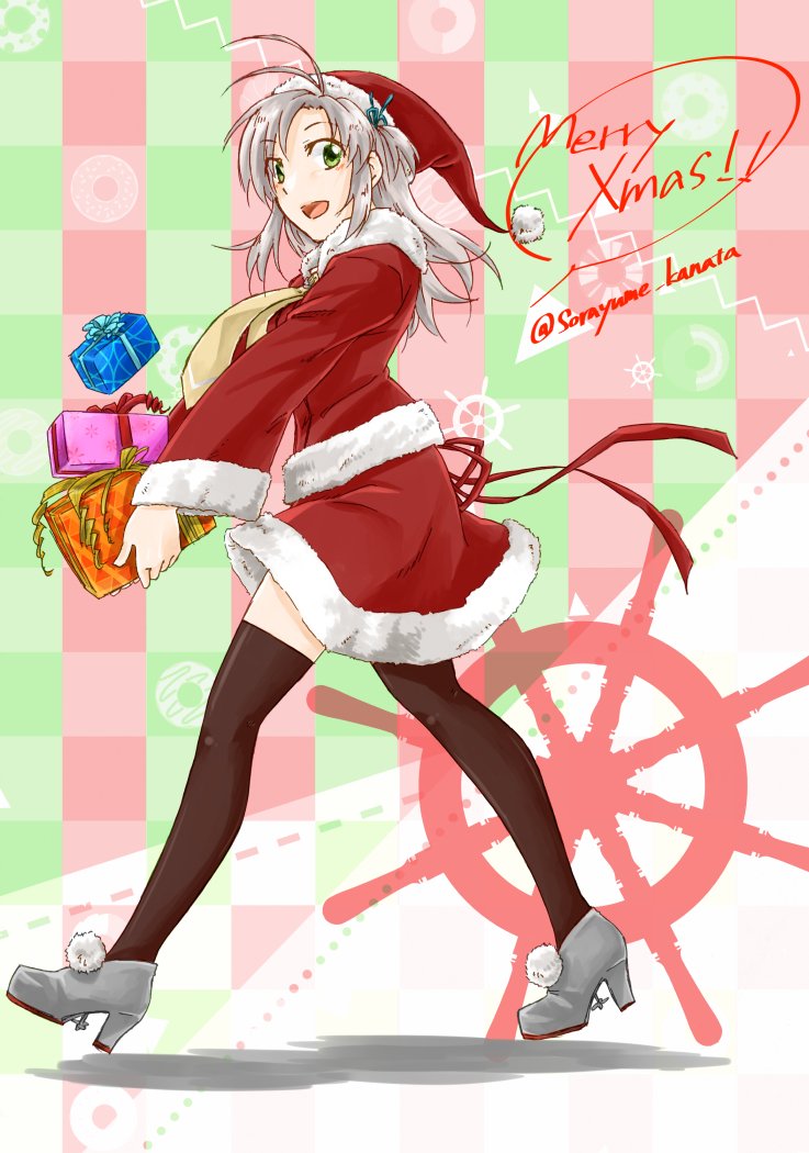1girl antenna_hair black_thighhighs boots box commentary_request dress full_body fur-trimmed_dress fur_trim gift gift_box green_eyes grey_hair hat kantai_collection kinugasa_(christmas)_(kancolle) kinugasa_(kancolle) kinugasa_kai_ni_(kancolle) long_hair merry_christmas official_alternate_costume red_dress red_hat santa_hat ship's_wheel solo sorayume_kanata thighhighs twitter_username white_boots