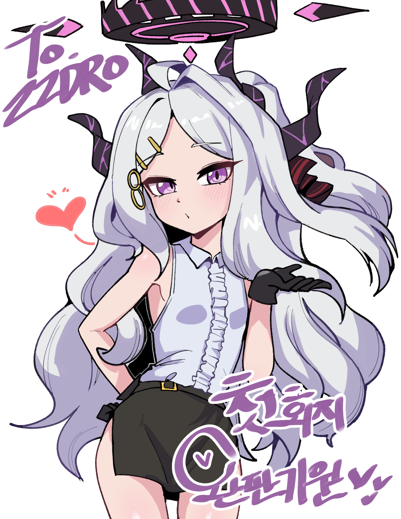 1girl ahoge black_gloves black_halo black_skirt blue_archive blush breasts demon_girl demon_horns gloves halo heart highres hina_(blue_archive) horns long_hair looking_at_viewer mago_cats purple_eyes simple_background skirt small_breasts solo white_background white_hair