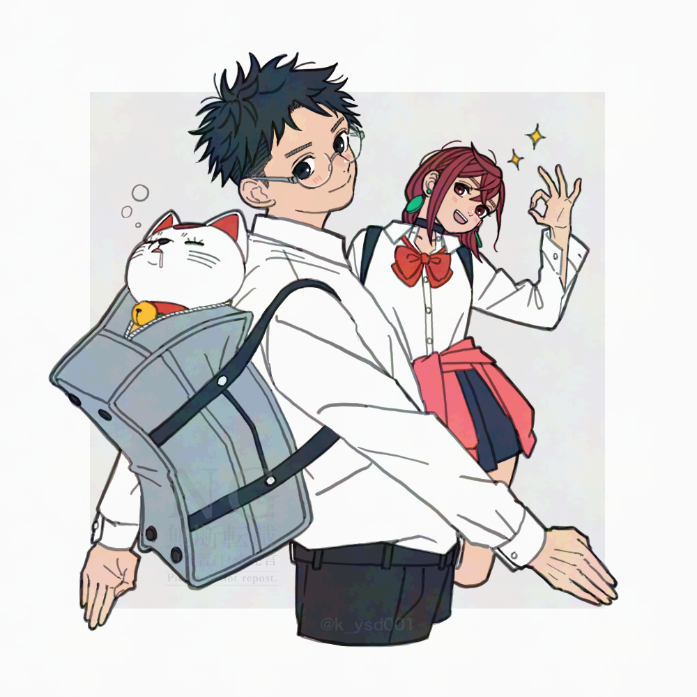 1boy 1girl 1other ayase_momo backpack bag bell black_choker black_hair black_pants blue_skirt blush border bow bowtie brown_eyes brown_hair cat choker closed_mouth clothes_around_waist collared_shirt commentary_request cowboy_shot cropped_legs dandadan earrings from_side glasses grey_background grey_bag hair_between_eyes head_tilt jewelry k_ysd001 light_blush long_sleeves looking_at_viewer looking_to_the_side loose_bowtie medium_hair neck_bell ok_sign open_mouth outside_border pants pink_sweater pleated_skirt red_bow red_bowtie round_eyewear school_uniform shirt short_hair skirt sleeping smile sparkle squeans sweater sweater_around_waist takakura_ken_(dandadan) turbo_granny_(dandadan) twitter_username white_border white_shirt
