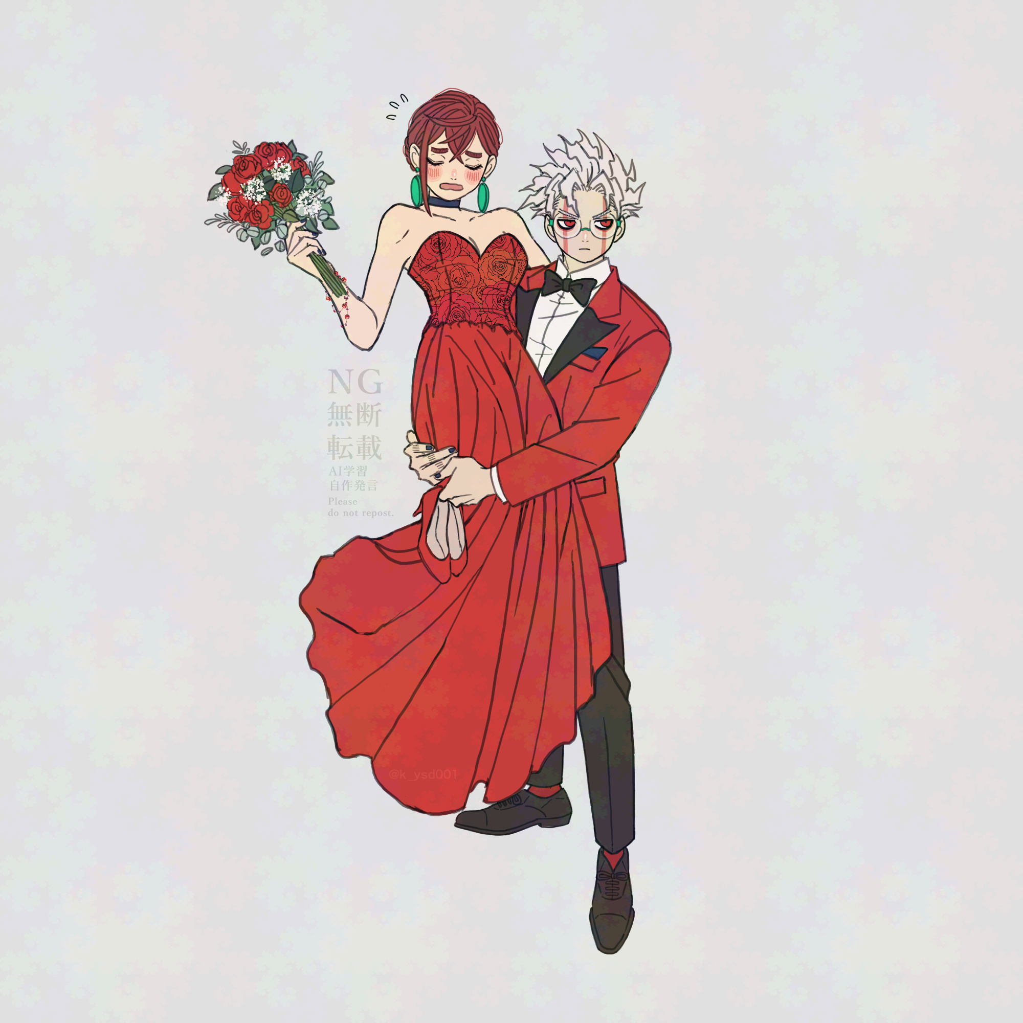 1boy 1girl alternate_costume ayase_momo bare_arms bare_shoulders black_bow black_bowtie black_choker black_nails black_pants black_shoes blush bouquet bow bowtie brown_hair carrying carrying_person choker closed_eyes closed_mouth collarbone collared_shirt commentary_request dandadan dress dress_shoes earrings facial_mark flower flying_sweatdrops full_body glasses grey_background high_heels highres holding holding_bouquet holding_shoes holding_unworn_clothes jacket jewelry k_ysd001 lifting_person long_dress open_mouth pants pocket_square pumps red_dress red_eyes red_flower red_jacket red_shoes round_eyewear shirt shoes short_hair standing strapless strapless_dress takakura_ken_(dandadan) takakura_ken_(transformed)_(dandadan) thick_eyebrows unworn_shoes white_flower white_hair white_shirt