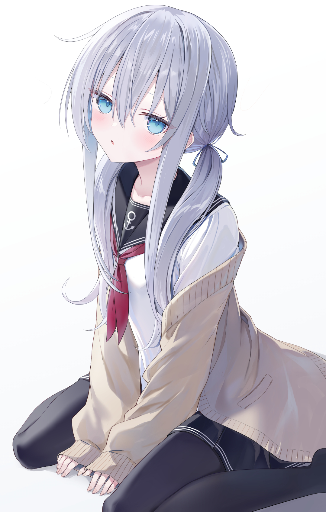 1girl alternate_hairstyle anchor_symbol black_sailor_collar black_skirt black_thighhighs blue_bow blue_eyes blush bow brown_cardigan cardigan collarbone commentary from_side grey_hair hair_between_eyes hair_bow hair_over_shoulder hair_ribbon hibiki_(kancolle) highres kantai_collection long_hair long_sidelocks long_sleeves looking_at_viewer low_twintails neckerchief open_cardigan open_clothes parted_lips pleated_skirt red_neckerchief ribbon sailor_collar shadow shikuro_(iorimiyakiyo) shirt sidelocks simple_background sitting skirt sleeves_past_wrists solo thighhighs twintails white_background white_shirt
