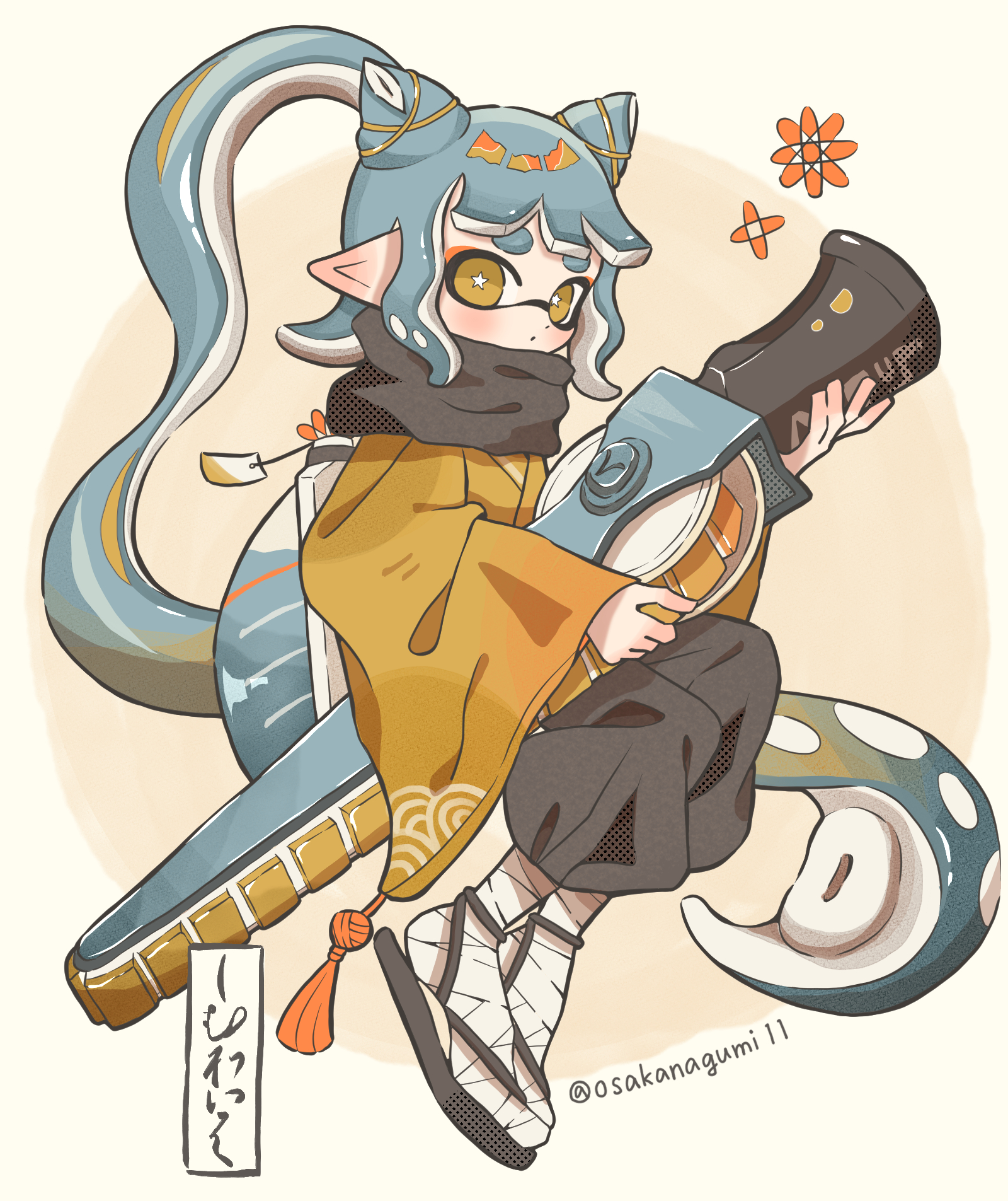 1girl absurdly_long_hair artist_name blue_hair blush bright_pupils commentary_request full_body hair_horns hair_ornament high_ponytail highres holding holding_sword holding_weapon inkling inkling_girl inkling_player_character long_hair looking_at_viewer nintendo osakanagumi11 pointy_ears ponytail sandals short_eyebrows solo splatana_stamper_(splatoon) splatoon_(series) splatoon_3 star-shaped_pupils star_(symbol) sword symbol-shaped_pupils tassel tentacle_hair thick_eyebrows twitter_username very_long_hair weapon white_pupils x_hair_ornament yellow_eyes zouri