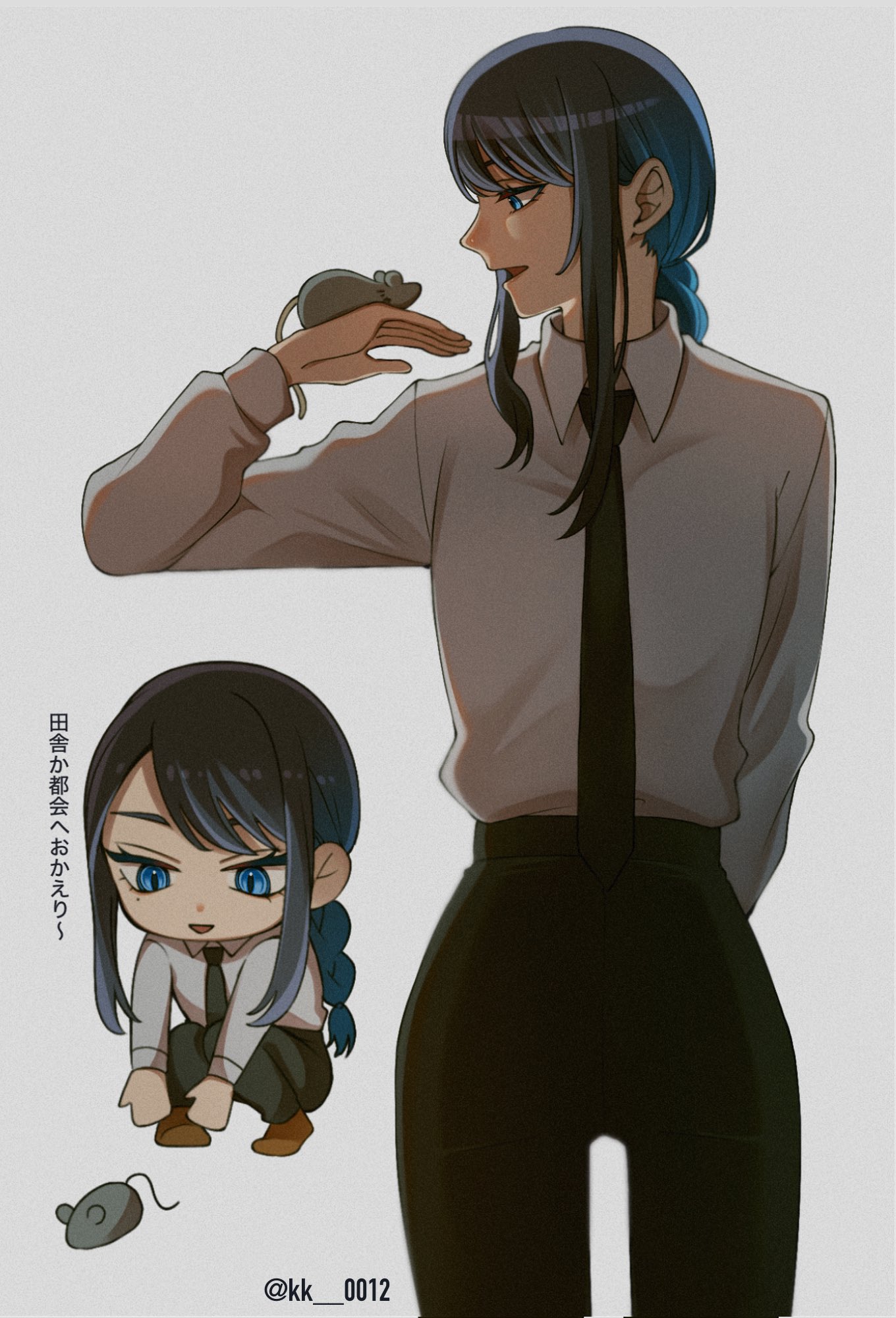 1girl ado_(utaite) black_hair black_necktie black_pants blue_eyes blue_hair braid chando_(ado) chibi commentary_request gradient_hair highres jacket keeko_(kk_0012) long_hair long_sleeves mouse_(animal) multicolored_hair necktie open_mouth pants shirt sidelocks simple_background squatting track_jacket white_background white_shirt
