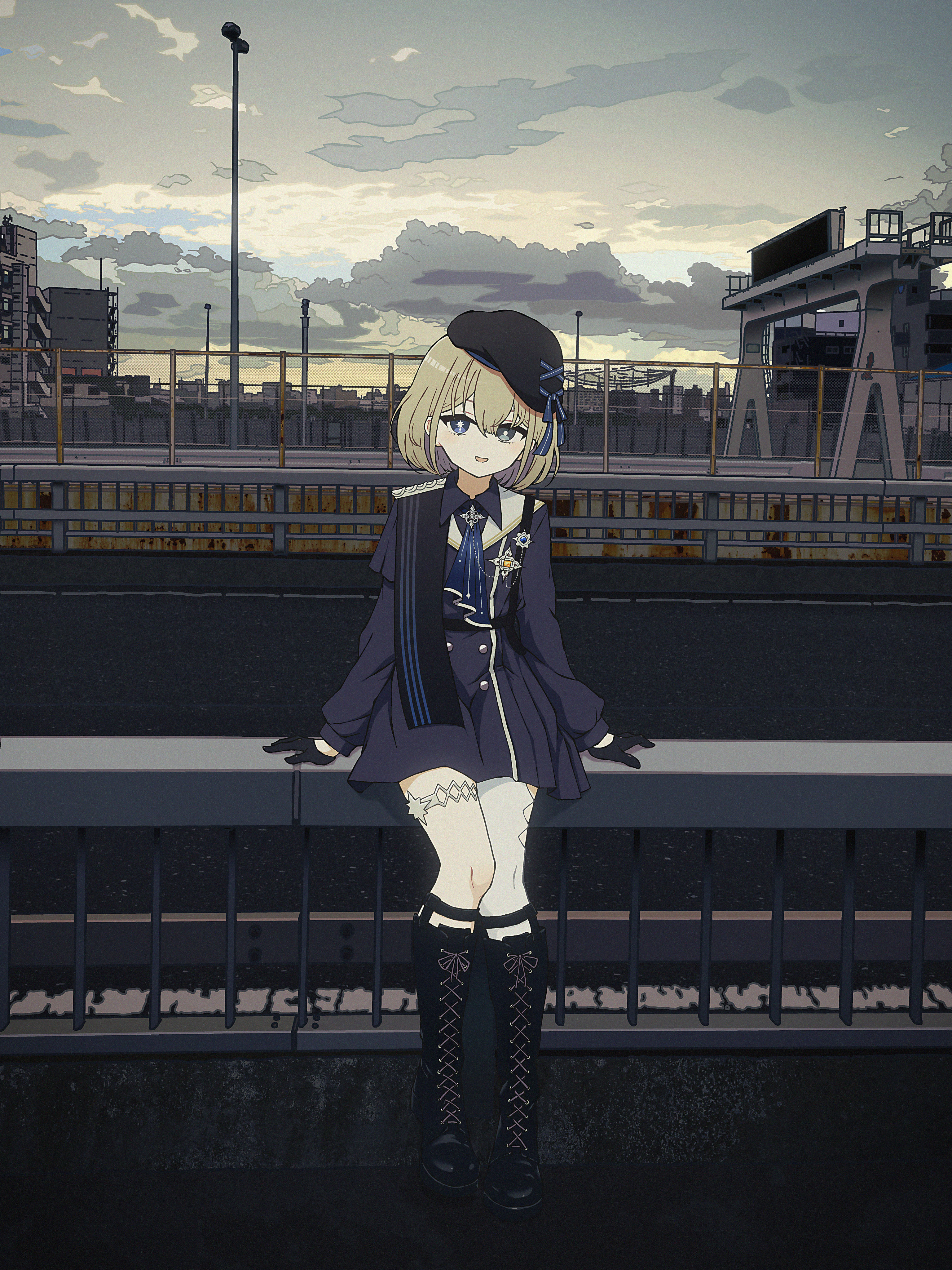 1girl absurdres against_railing ascot beret black_boots black_dress black_gloves black_hat blonde_hair blue_eyes boots buttons cloud cloudy_sky commentary_request double-breasted dress gloves hakushiro_tsukumo half_gloves hat highres indie_virtual_youtuber knee_boots lace-up_boots looking_at_another looking_at_viewer nkymyura outdoors railing road short_hair single_thighhigh sky smile solo thigh_strap thighhighs virtual_youtuber