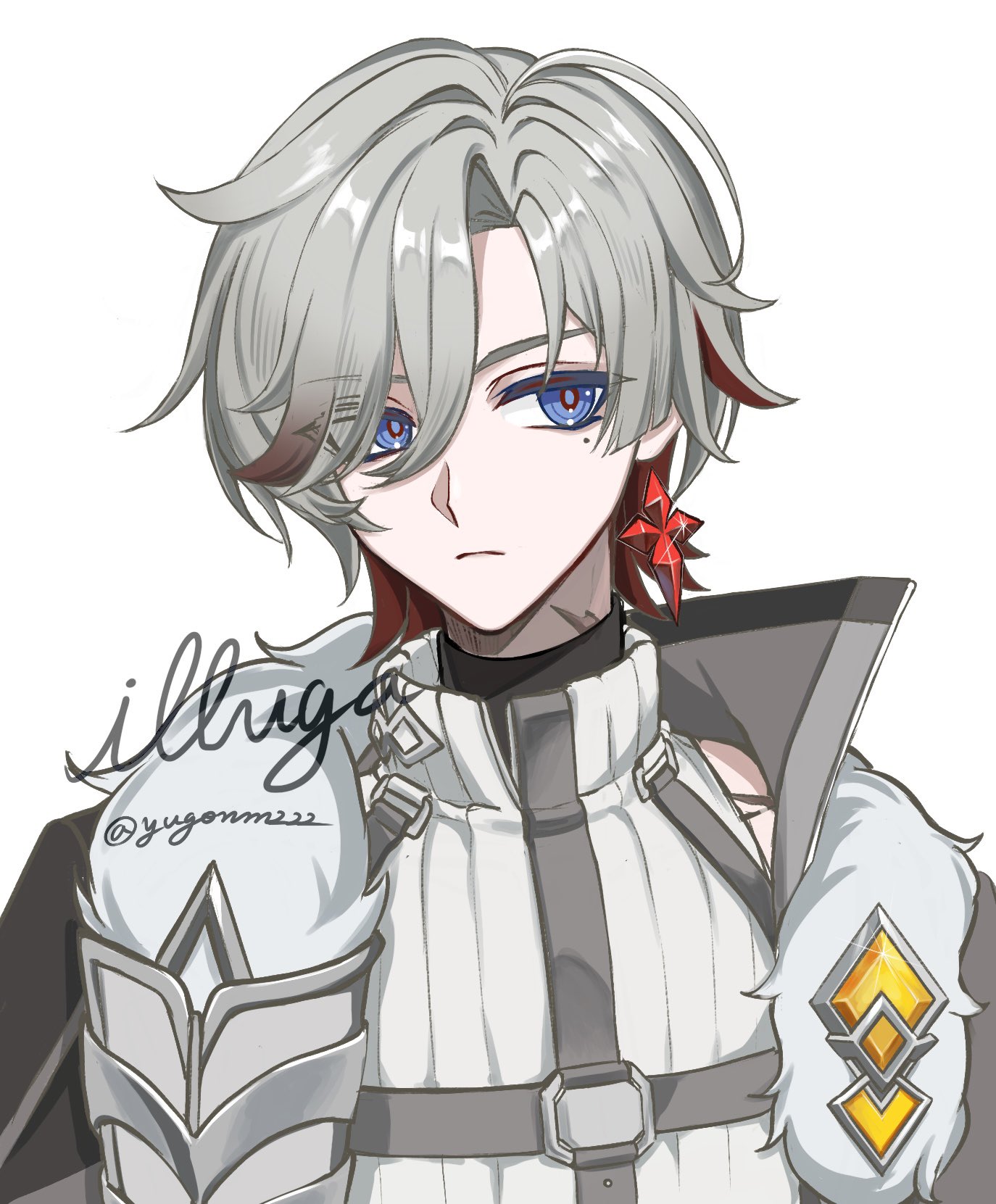 1boy blue_eyes character_name commentary_request earrings eyes_visible_through_hair fur_trim gem genshin_impact grey_hair highres illuga_(genshin_impact) jewelry looking_to_the_side male_focus mole mole_under_eye multicolored_hair red_hair silver_trim single_earring sleeveless sleeveless_turtleneck solo turtleneck two-tone_hair watermark white_background yellow_gem yugo_(yugonm222)