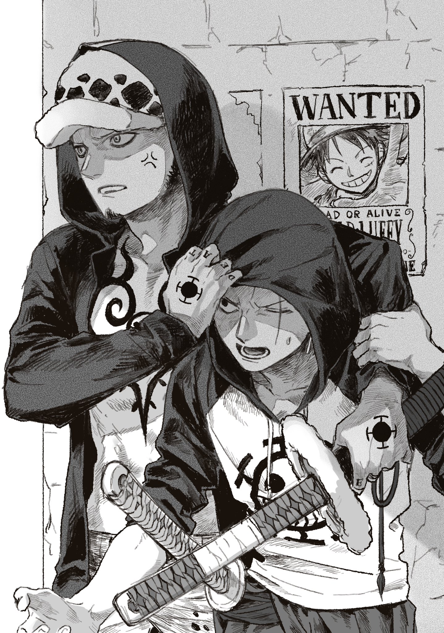 2boys 53_(kanimisomrmr) anger_vein borrowed_clothes chest_tattoo facial_hair goatee greyscale hand_tattoo highres holding holding_sword holding_weapon hood hood_up long_sleeves male_focus monkey_d._luffy monochrome multiple_boys one_piece open_mouth roronoa_zoro scar scar_across_eye scar_on_face sword tattoo trafalgar_law wanted_poster weapon