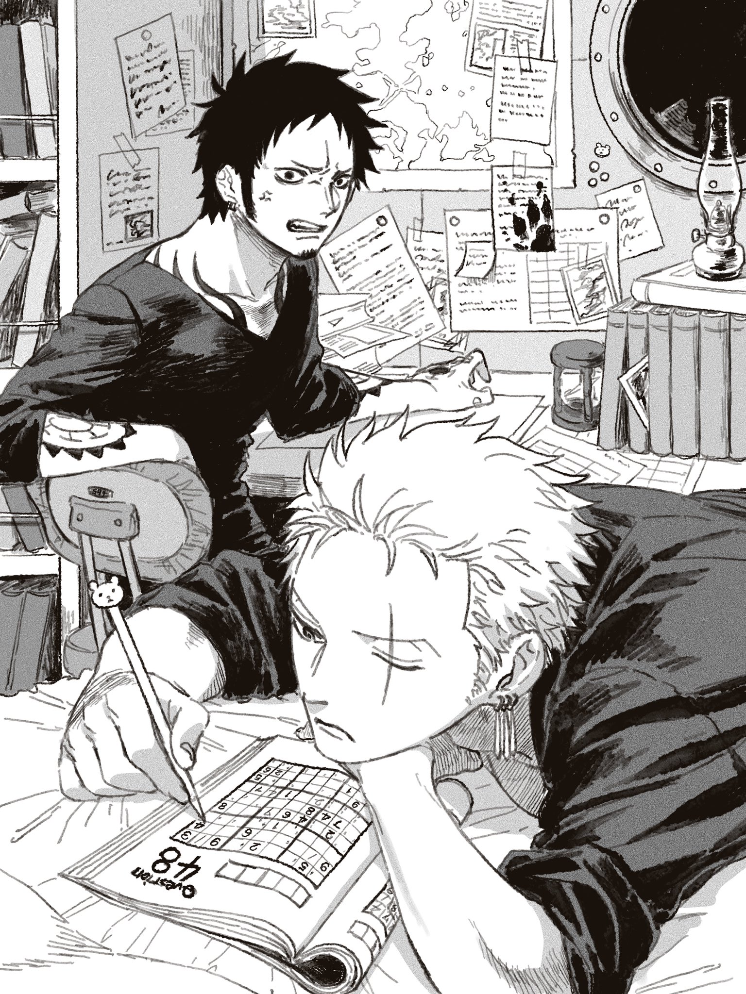 2boys 53_(kanimisomrmr) angry book bookshelf closed_mouth commentary_request earrings facial_hair goatee greyscale highres holding holding_pencil hourglass indoors jewelry male_focus map monochrome multiple_boys oil_lamp one_piece pencil roronoa_zoro scar scar_across_eye scar_on_face short_hair sitting sudoku trafalgar_law