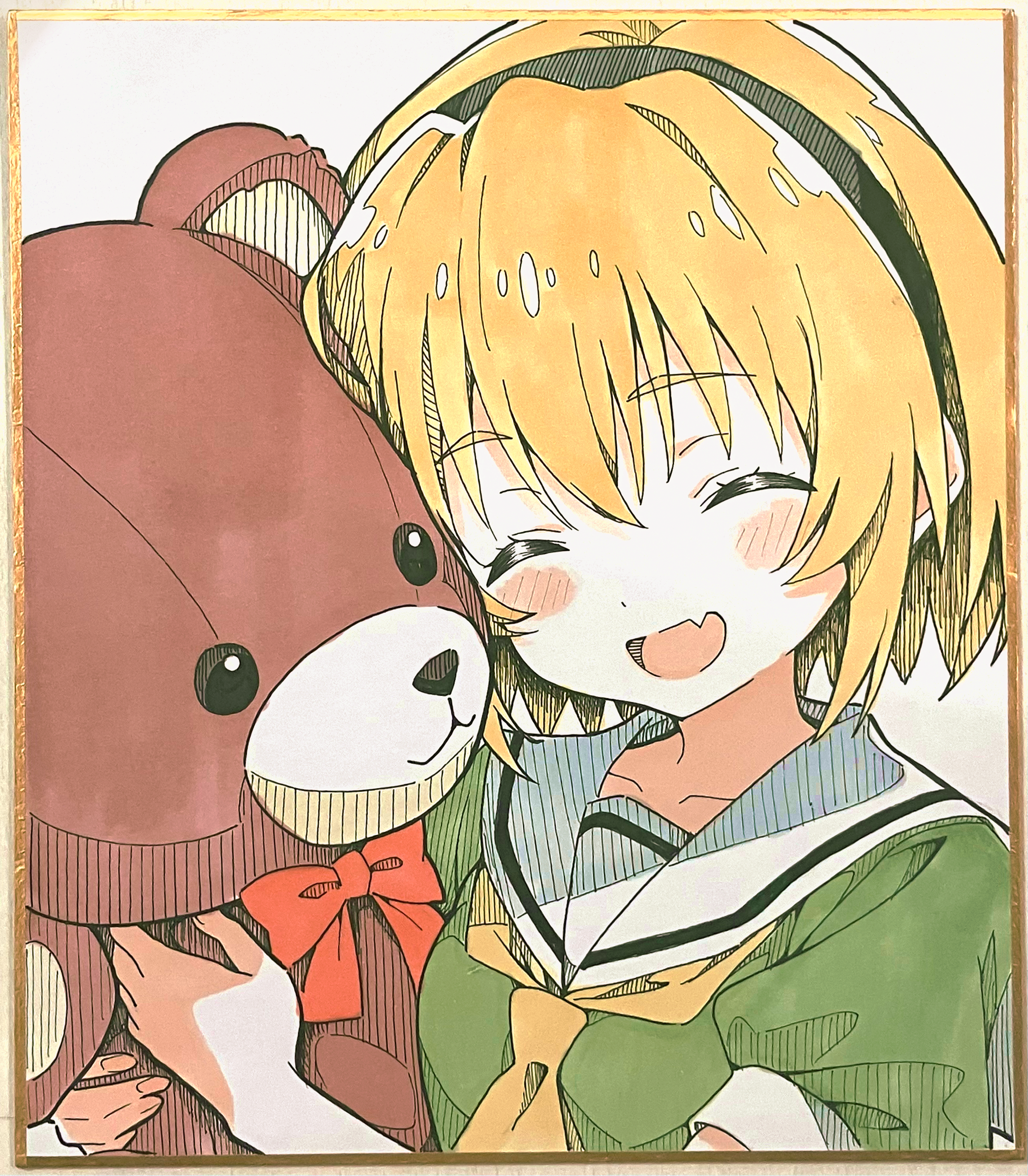 1girl :d ^_^ absurdres black_hairband blonde_hair blush_stickers bow bowtie closed_eyes collarbone commentary_request fang green_shirt hair_between_eyes hairband highres higurashi_no_naku_koro_ni houjou_satoko neckerchief niyane open_mouth portrait red_bow red_bowtie sailor_collar shirt short_hair short_sleeves simple_background skin_fang smile solo stuffed_animal stuffed_toy teddy_bear traditional_media white_background white_sailor_collar yellow_neckerchief