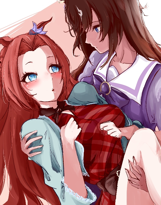 2girls animal_ears blue_eyes blue_jacket bow bowtie brown_hair carrying commentary_request dress duramente_(umamusume) hair_intakes horse_ears horse_girl horseshoe_ornament jacket kawakami_princess_(casual)_(umamusume) kawakami_princess_(umamusume) long_hair looking_at_another multicolored_hair multiple_girls pakarappakaratt plaid_clothes plaid_dress princess_carry puffy_short_sleeves puffy_sleeves purple_bow purple_bowtie purple_shirt red_dress sailor_collar sailor_shirt school_uniform shirt short_sleeves streaked_hair tracen_school_uniform umamusume umamusume_horse_relations white_hair white_streaks