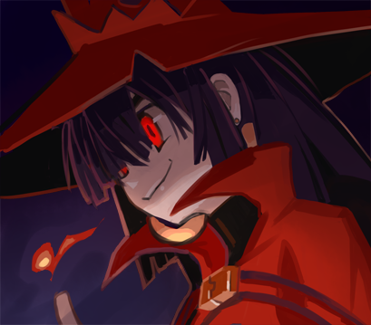1girl achika_(overlord_jc) cape dim_lighting earrings fire from_side glowing glowing_eyes gold_earrings hat high_collar index_finger_raised jewelry looking_at_viewer lowres magic original overlord_jc portrait profile pyrokinesis red_cape red_eyes red_hat sideways_glance smile solo sphere_earrings witch witch_hat