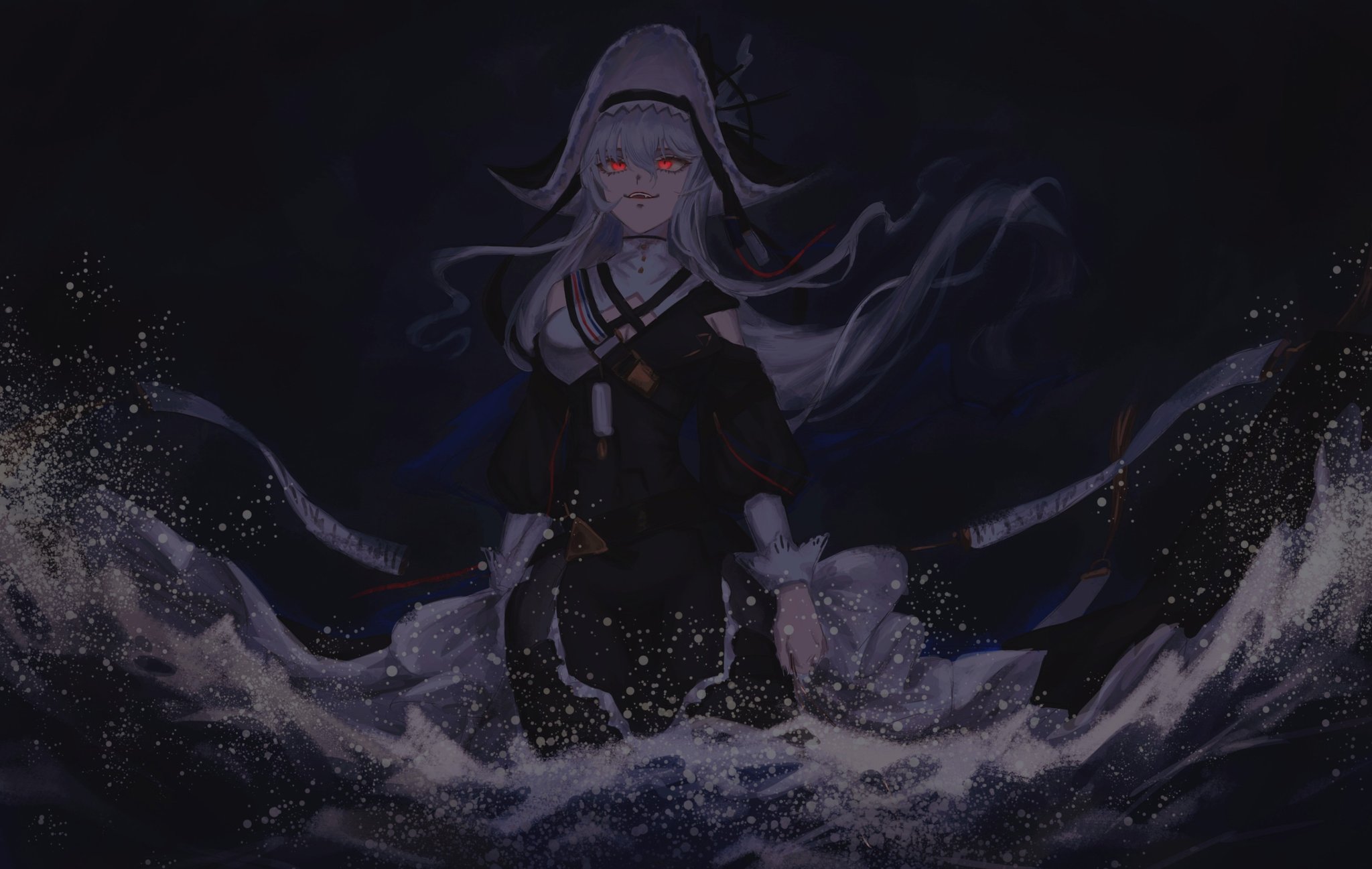 arknights dark hat highres looking_up nate71762013 ocean open_mouth red_eyes smile specter_(arknights) specter_the_unchained_(arknights) teeth upper_teeth_only waves
