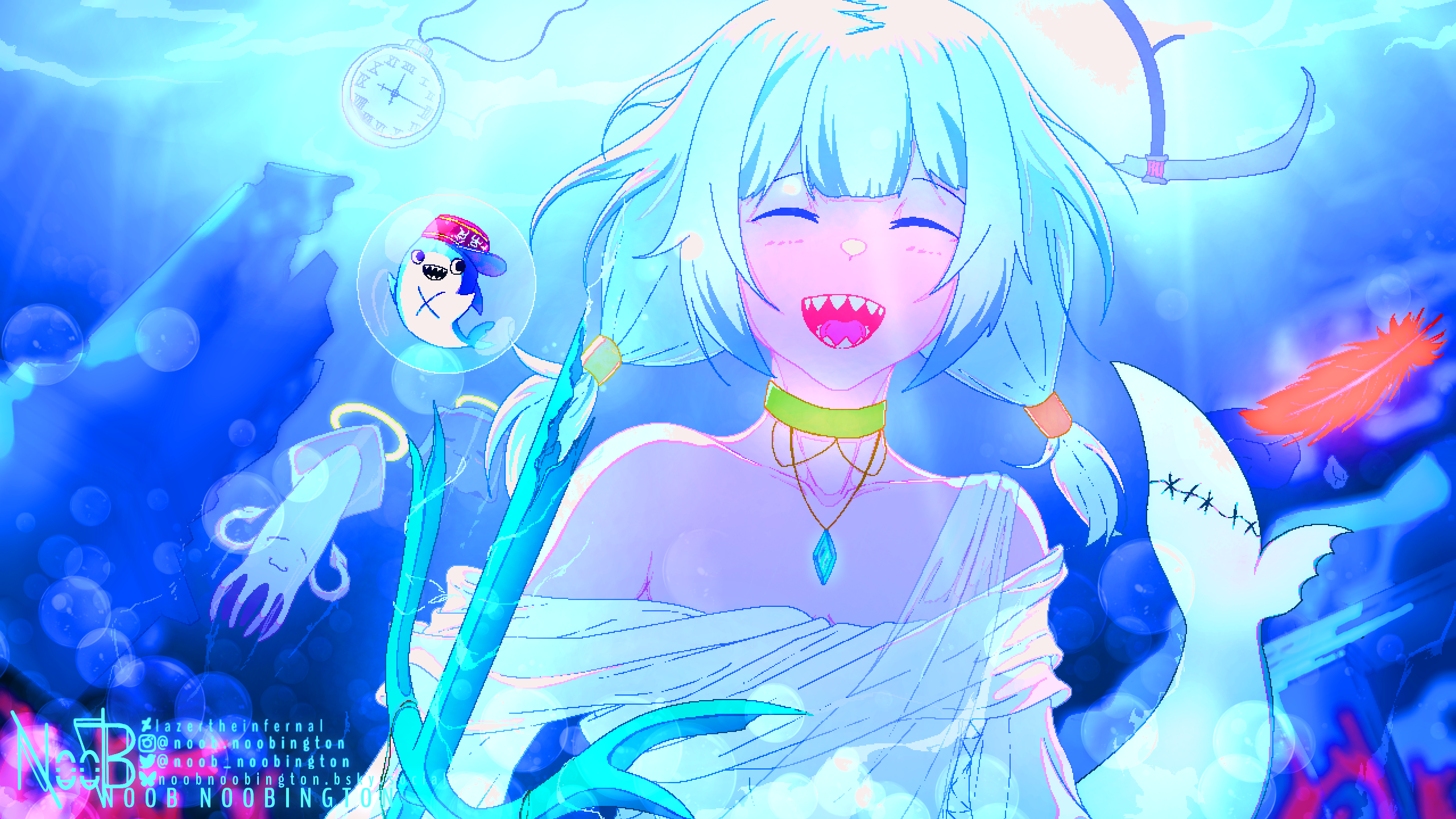 alternate_costume alternate_hairstyle bloop_(gawr_gura) bubble choker closed_eyes feathers fins fish_tail gawr_gura happy highres holding holding_polearm holding_weapon hololive hololive_english ikadachi jewelry multicolored_hair necklace noob_noobington open_mouth pocket_watch polearm revision ruins scythe shark_tail sharp_teeth short_twintails smile tail takodachi_(ninomae_ina'nis) teeth trident twintails underwater virtual_youtuber watch watermark weapon