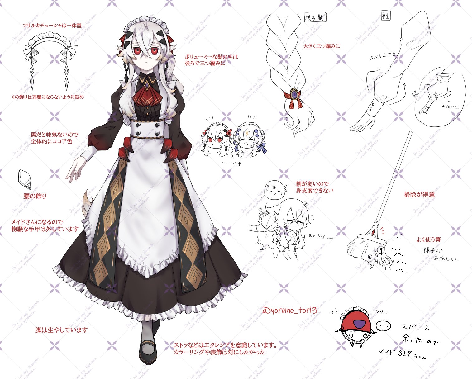 1girl alternate_costume alternate_hairstyle apron ascot black_dress blazing_cartesia_the_virtuous commentary_request dress ecclesia_(yu-gi-oh!) frilled_apron frilled_dress frilled_hairband frills full_body grey_socks hair_between_eyes hairband highres incredible_ecclesia_the_virtuous long_hair long_sleeves maid maid_apron maid_headdress puffy_long_sleeves puffy_sleeves red_ascot red_eyes reference_sheet socks solo_focus translation_request white_apron yoruno_tori3 yu-gi-oh!