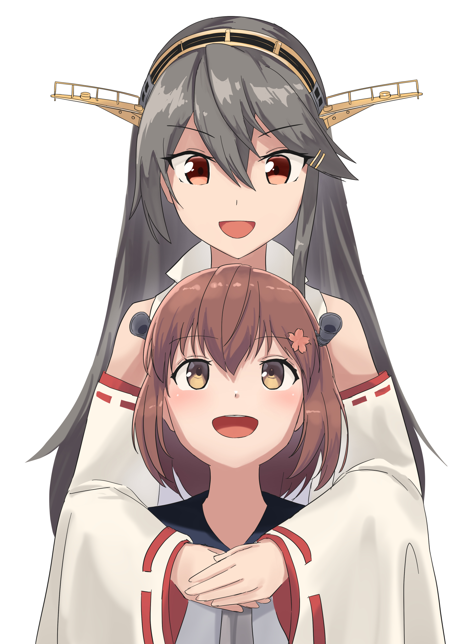 black_hair black_sailor_collar brown_eyes brown_hair dress haruna_(kancolle) haruna_kai_ni_(kancolle) highres hug hug_from_behind kantai_collection long_hair looking_up popped_collar ribbon-trimmed_sleeves ribbon_trim sailor_collar sailor_dress short_hair simple_background white_background yuki_4040 yukikaze_(kancolle) yukikaze_kai_ni_(kancolle)