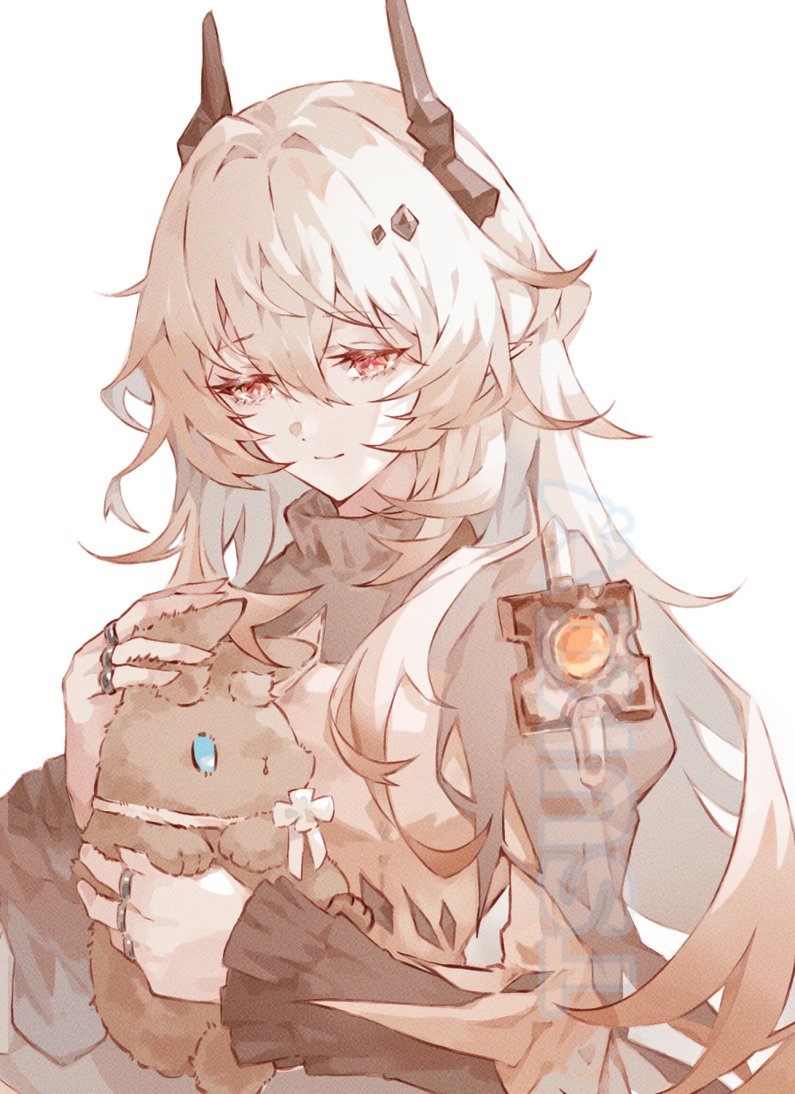 1girl amiya_(arknights) arknights chinese_commentary choshanland_plushy_(arknights) closed_mouth commentary_request demon_horns dress hair_between_eyes highres holding holding_stuffed_toy horns jewelry long_hair long_sleeves multiple_rings originium_(arknights) pink_hair ring ring_on_every_finger simple_background smile solo_focus stuffed_animal stuffed_rabbit stuffed_toy theresa_(arknights) tsukihana_l turtleneck turtleneck_dress white_background white_dress