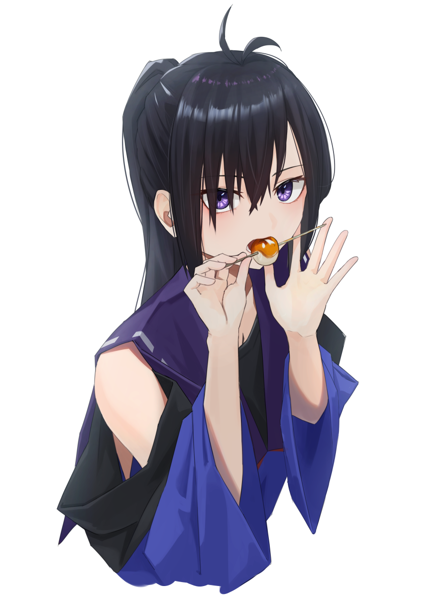 1girl antenna_hair black_hair commentary_request cropped_torso eating hair_between_eyes highres holding imomochi kis_sako looking_at_viewer original ponytail purple_eyes simple_background solo white_background