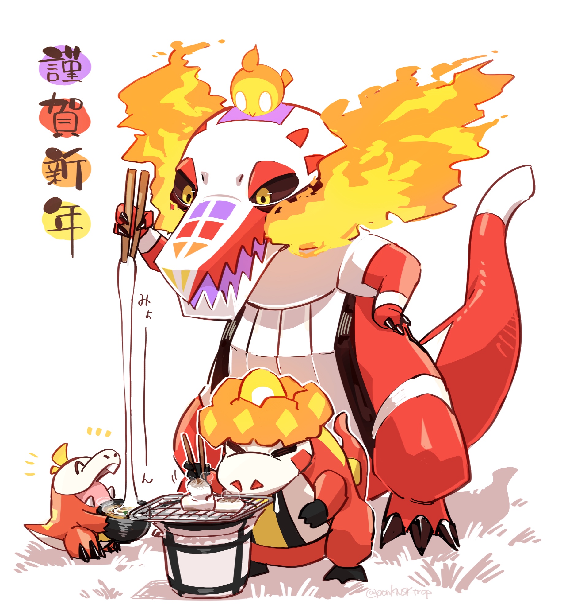 black_sclera chopsticks claws colored_sclera commentary_request cooking crocalor evolutionary_line fire fire_bird_(skeledirge) food fuecoco gen_9_pokemon happy highres holding holding_chopsticks mochi nintendo no_humans pokemon pokemon_(creature) pon_(ponymmtknsk) portable_stove skeledirge translation_request white_background